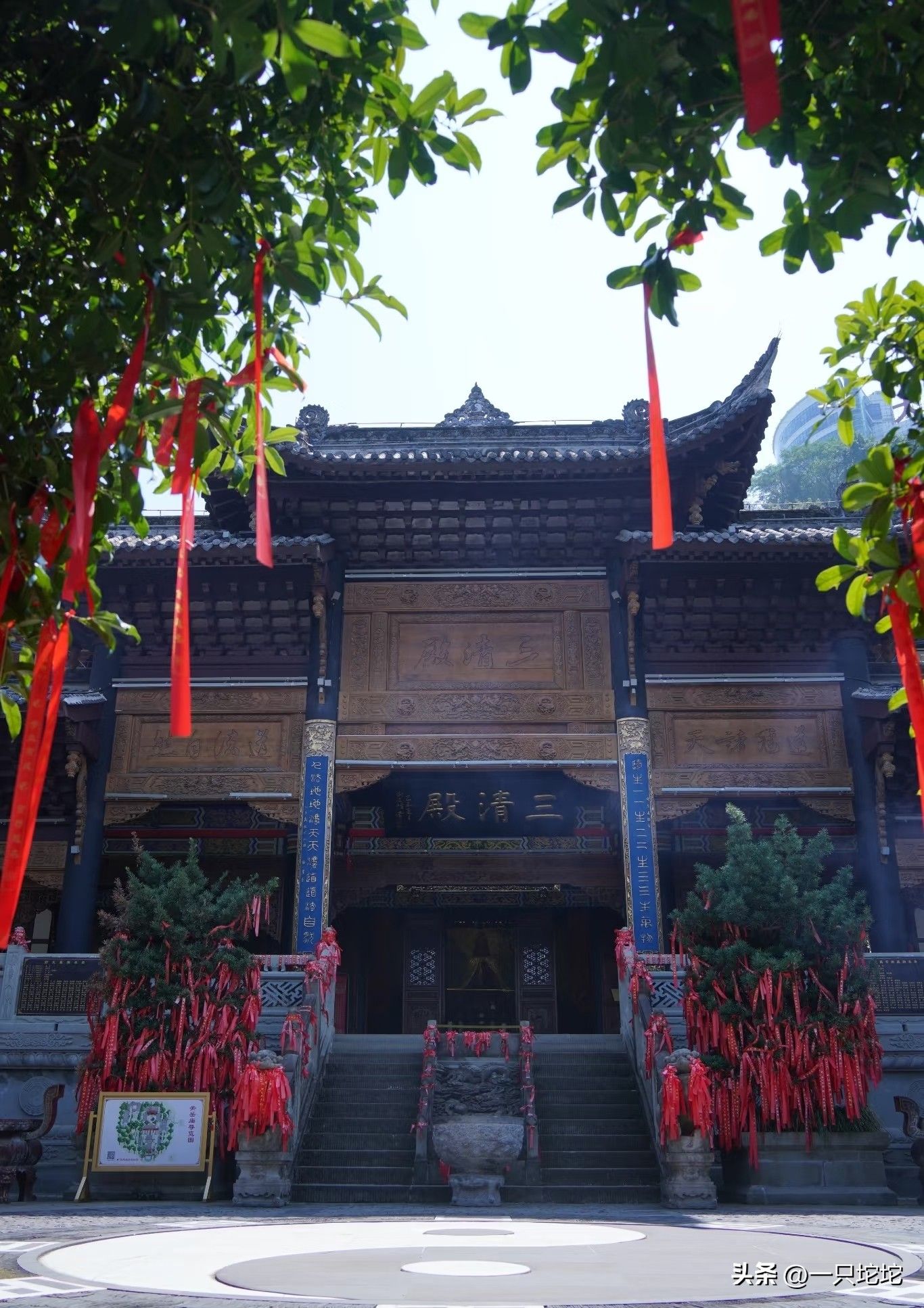 - 殿内供奉着3米高的关羽铜像、岳飞神像,还有玉清元始天尊、上清灵宝天尊、太清道德天尊三位三清神像,庄严又有气势;