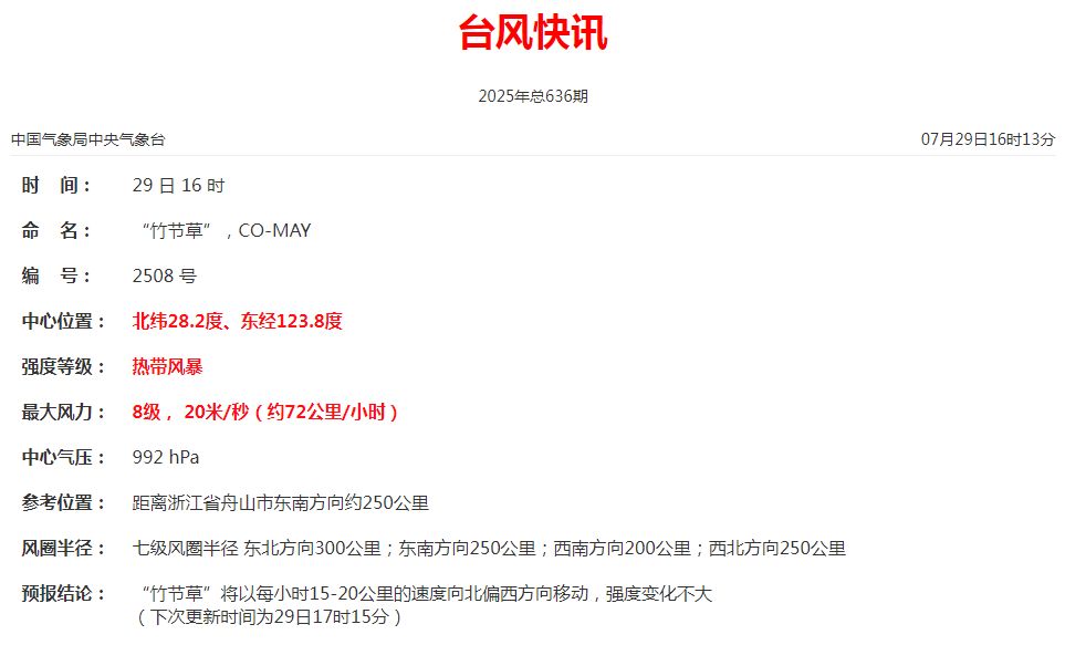 受其环流影响,7月29日8时至30日8时,浙江东部、福建东南部等地有大到暴雨,局地有雷暴大风等强对流天气,浙江中北部、江西西部、福建西南部等地的部分地区将有短时强降水天气。