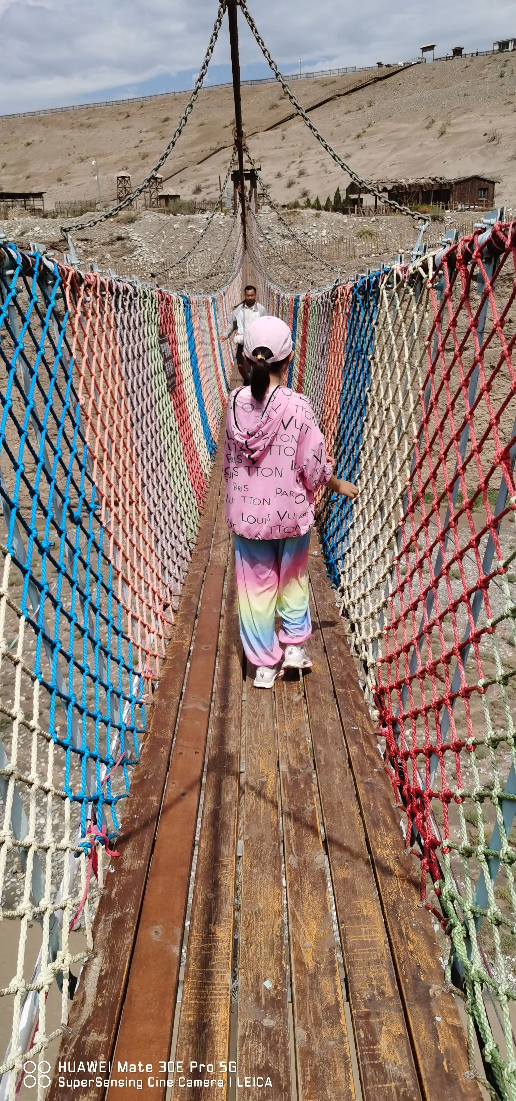 下了索道踏上登山步道,碎石路被阳光晒得发烫,每一步都能听见鞋底与砂砾的摩擦声。行至半山腰时,视野豁然开朗——一座彩虹桥横跨在两侧河床间,橙红、明黄、靛蓝的钢索在戈壁的灰黄底色中格外鲜亮,像一道凝固的霓虹。