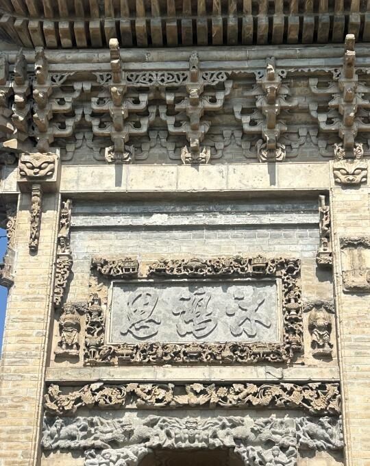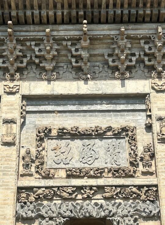 门楣镶嵌三块石匾,题写有“膺凤诏”“何天休”“沐鸿恩”,背面则为“昭德”“景行”“光裕”,匾额四周及上下枋有砖雕花草及人物图案。八仙、文武官员、葡萄、蝙蝠等砖雕、石雕图案,无一不展现着晋南砖雕、石雕的超高水准。