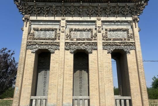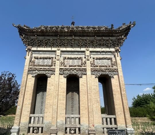 碑楼为砖仿木结构,单檐歇山顶,坐东朝西,面宽三间,进深一间,檐下设仿木砖雕五彩凤翘斗拱。