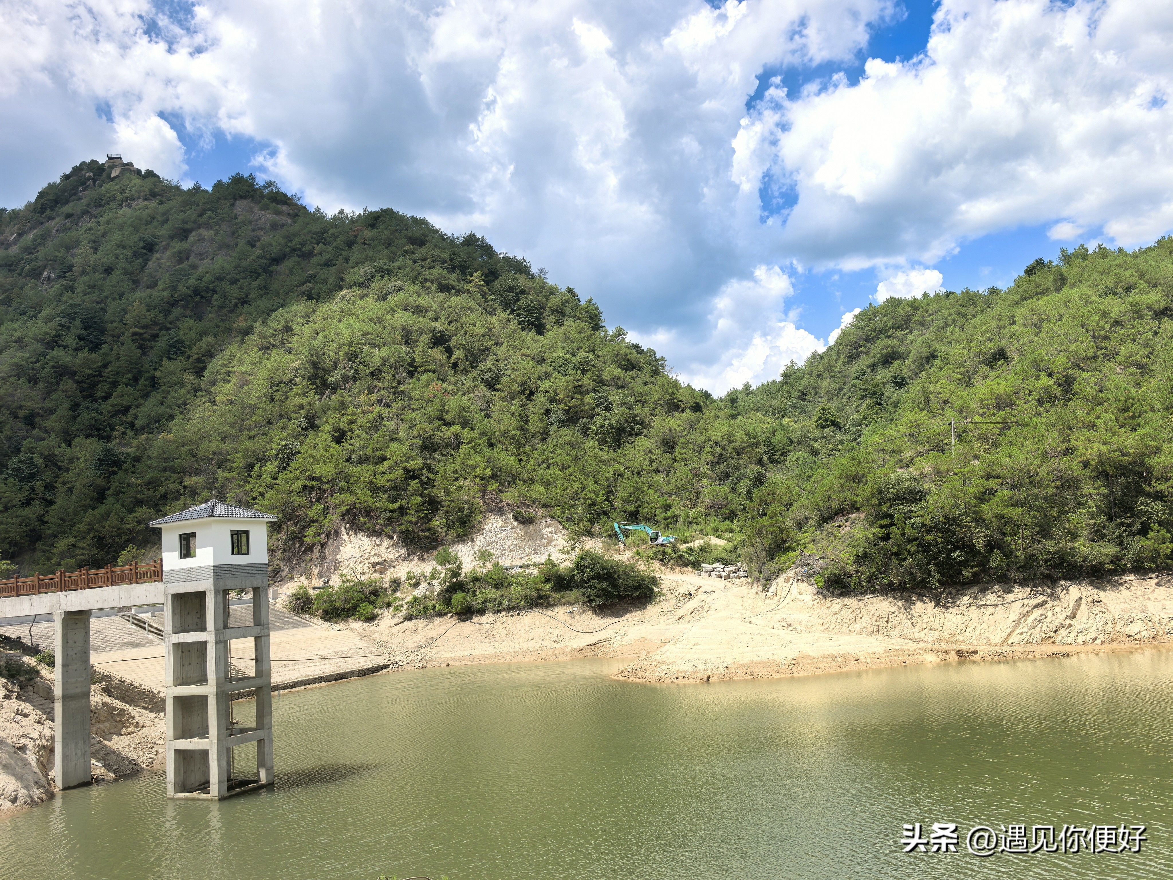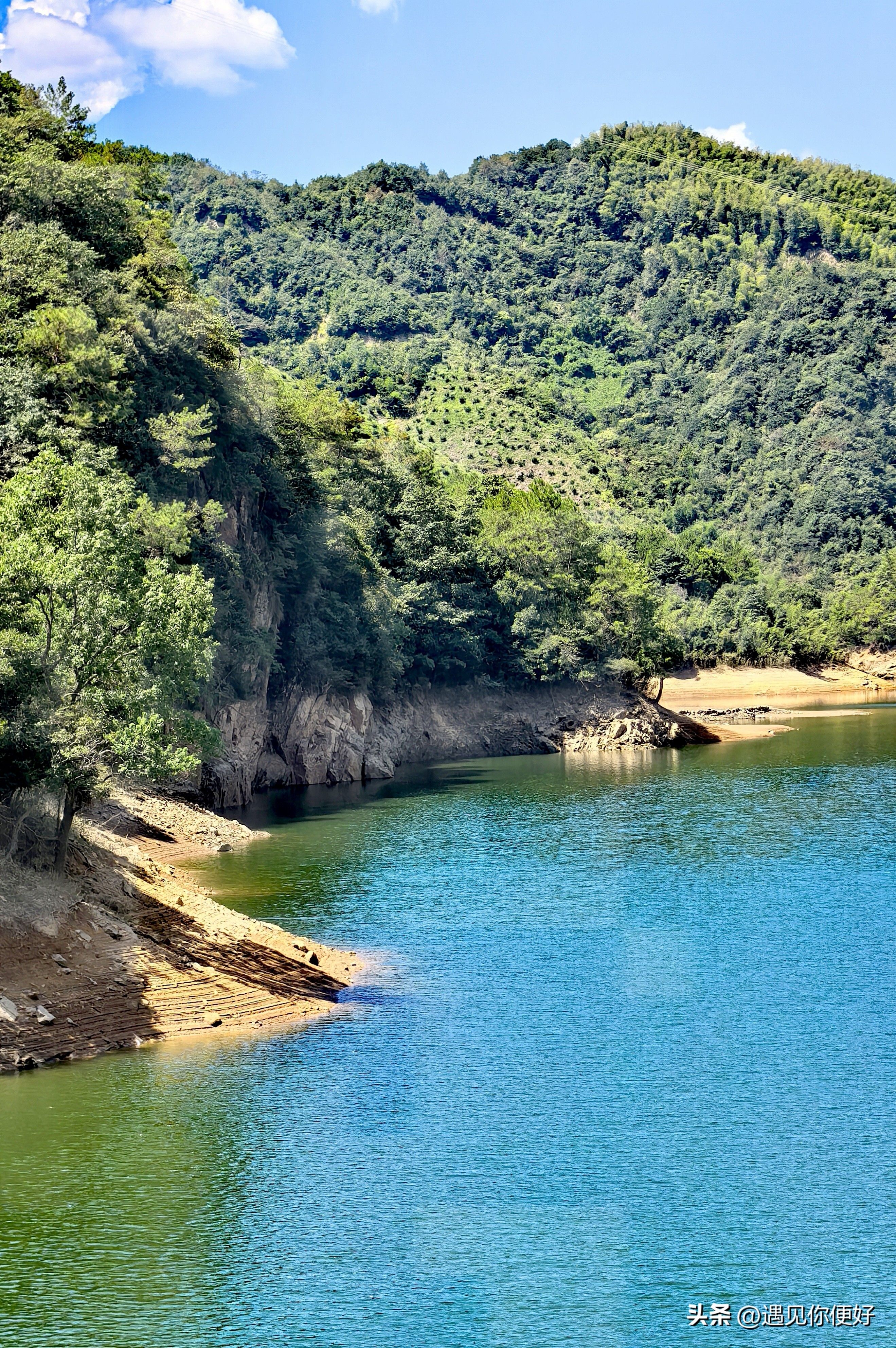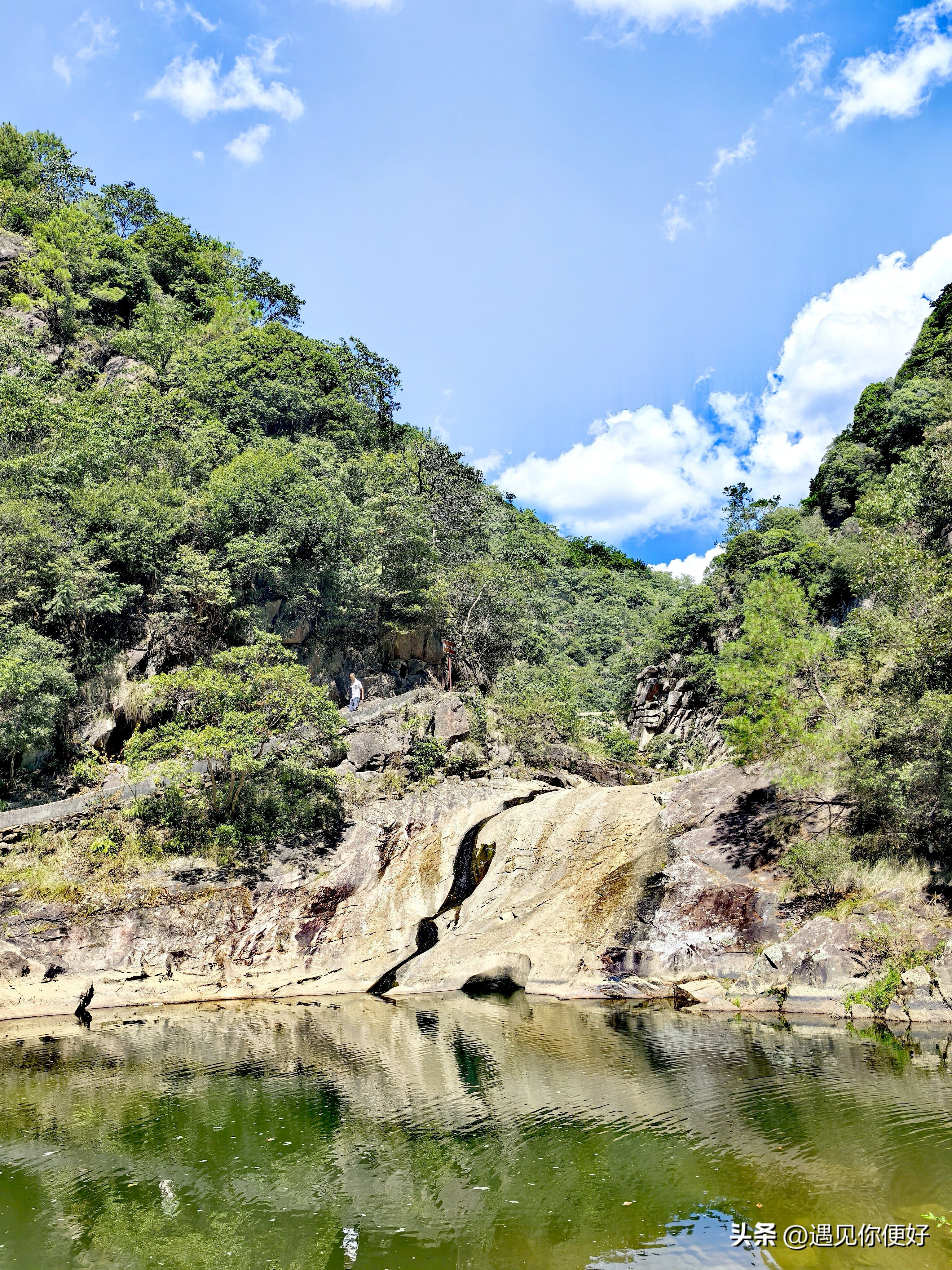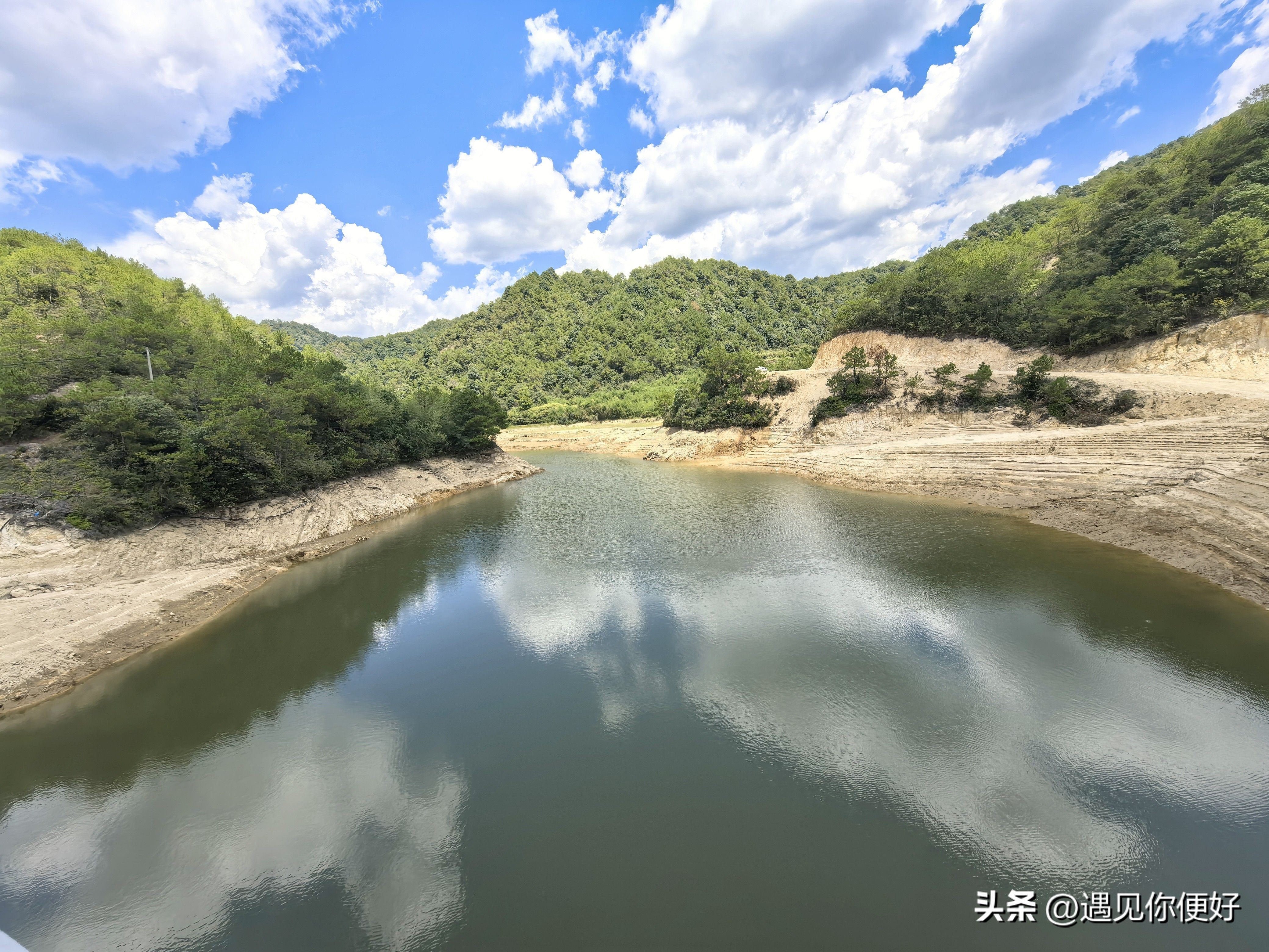 网红打卡地“三井龙潭”由三井和三龙潭组成,分别位于下蔡岙村高婆山自然村和上蔡岙村山岸自然村。不了解时不知其奇妙,了解后才恍然大悟。我先到了上蔡岙村,本打算徒步走“上蔡岙鹰嘴岩三井龙潭元宝山上蔡岙”大环线,看轨迹全程12.44公里。但爬了3公里山路后,顺着轨迹沿途没看到飘带,路迹不明显,加上天气炎热,我决定沿原路返回,再驾车直奔三井龙潭和下蔡岙村徒步赏景。从三井龙潭入口处左侧往里直走600米,就能到达第一龙潭、第二龙潭和第三龙潭。第二龙潭边有龙皇庙和岩雨亭,第三龙潭有三井龙王殿,再沿着峡谷往里走,可直达三井水电站与三井水库。毕竟是网红打卡点,沿途不时能看到游客或独自、或结伴前来游玩。三个龙潭水量虽不算大,但风景秀丽,很适合在炎热天气里乘凉、吹山风。从三井龙潭出来,驾车几分钟就能到下蔡岙村,我在此停留,欣赏滑塌岩水库的风光。