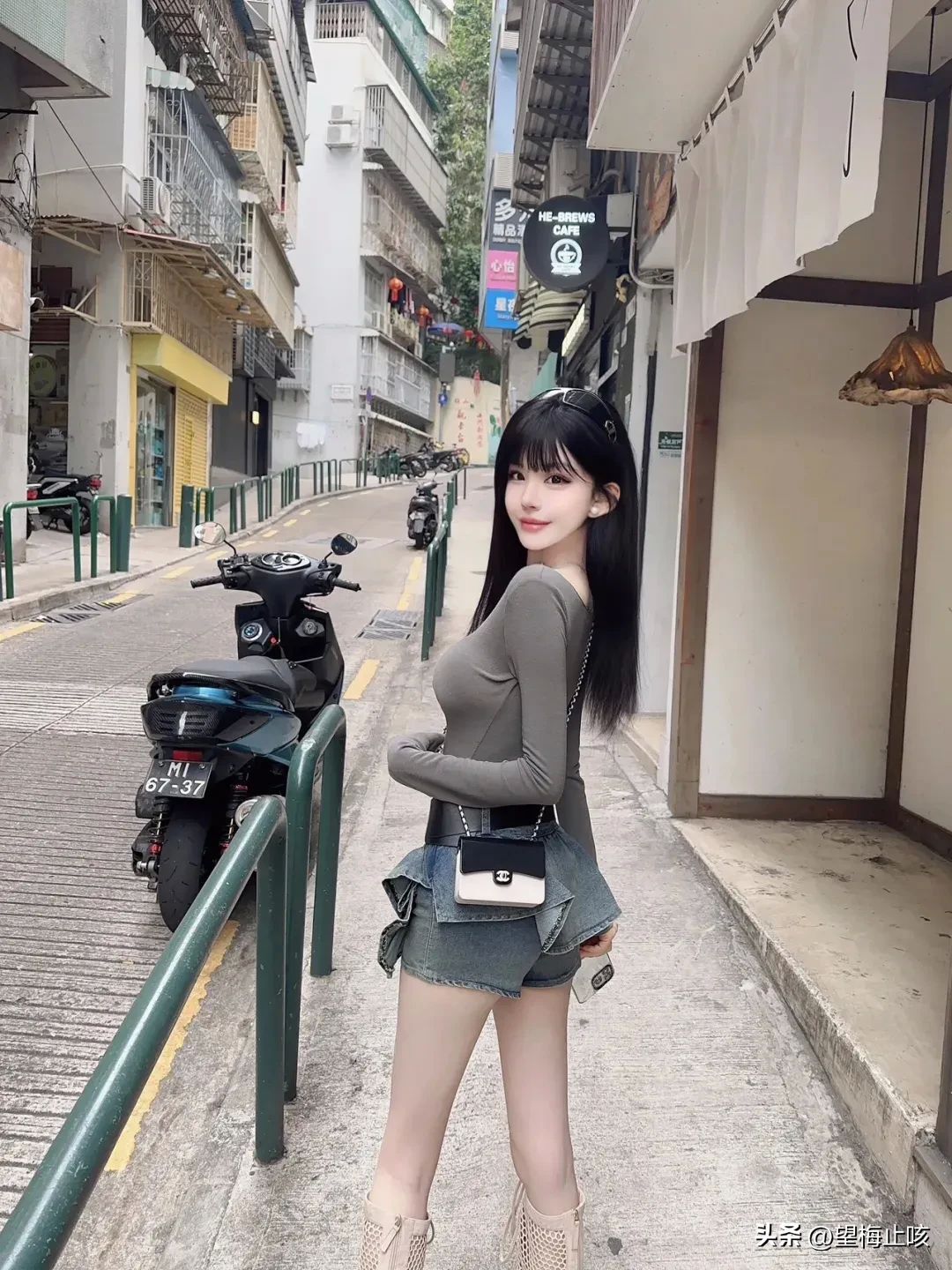 漫步在澳门的街头,狭窄的街道两旁是充满年代感的建筑,斑驳的墙壁仿佛在诉说着这座城市的故事。涂鸦墙、特色小店,还有那一辆辆停靠在路边的摩托车,构成了充满生活气息的画面。女孩在这样的环境中,时而倚靠着街边的栏杆,时而在涂鸦墙前驻足,她的每一个动作都与周围的环境和谐相融,仿佛是从时尚杂志中走出的模特,又像是这座城市的灵动精灵。