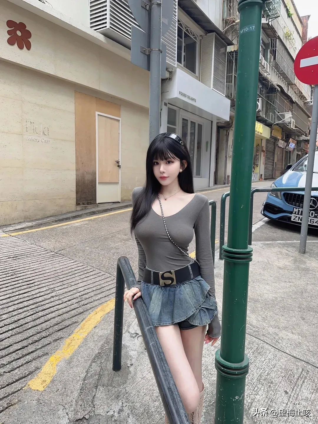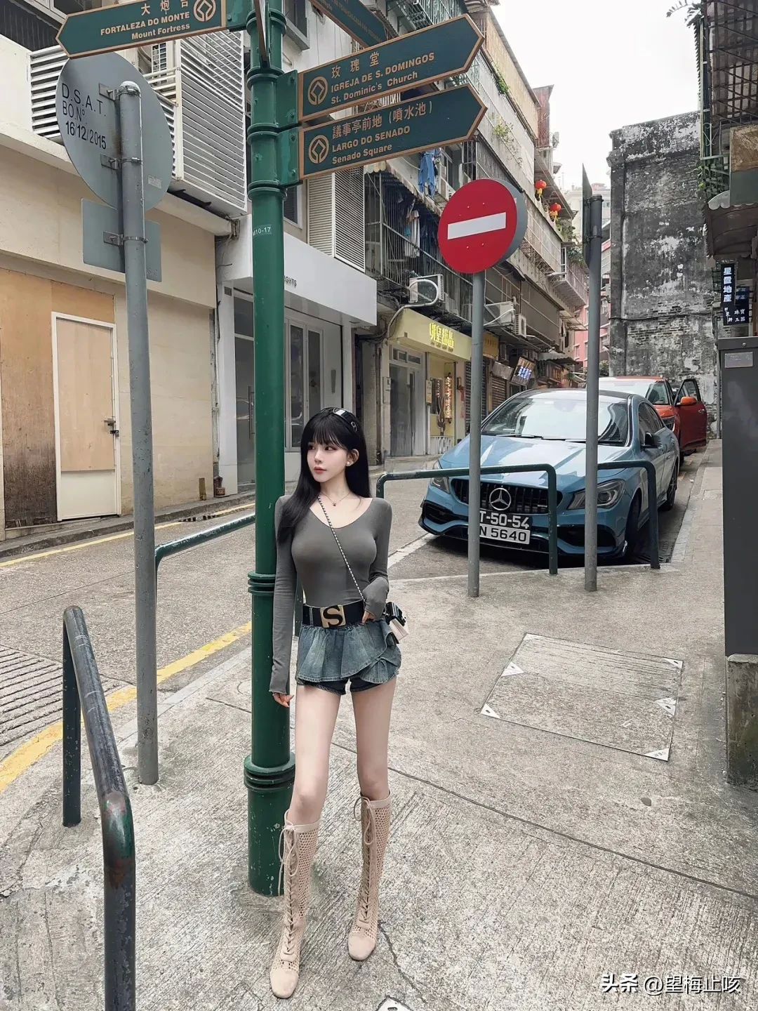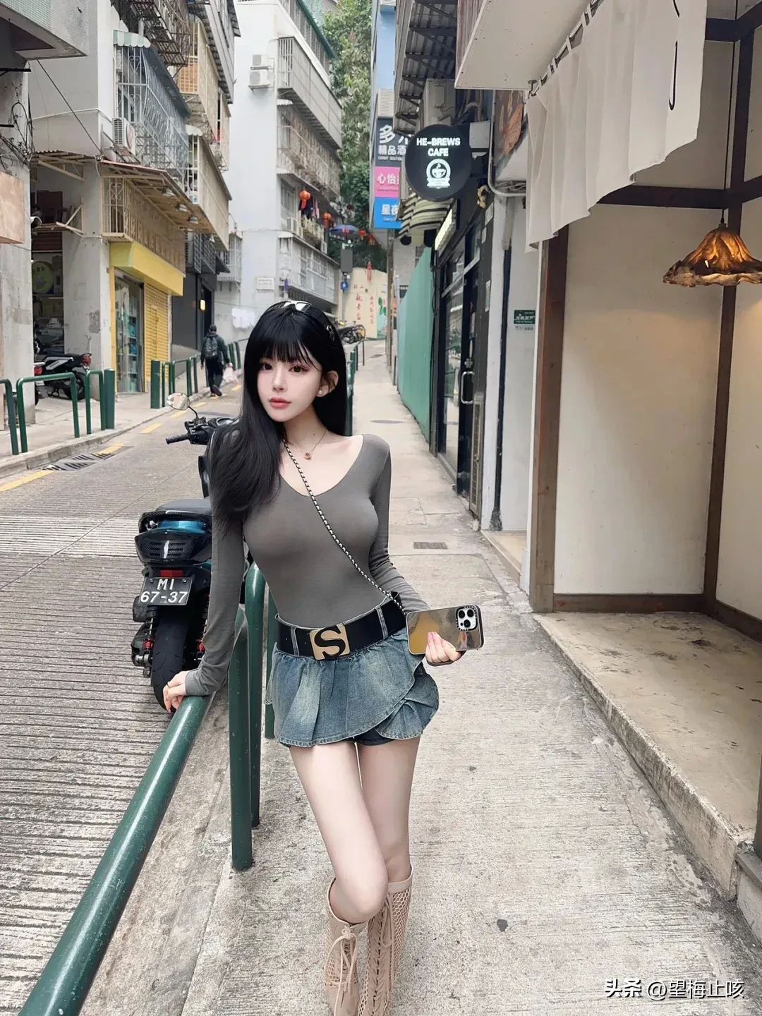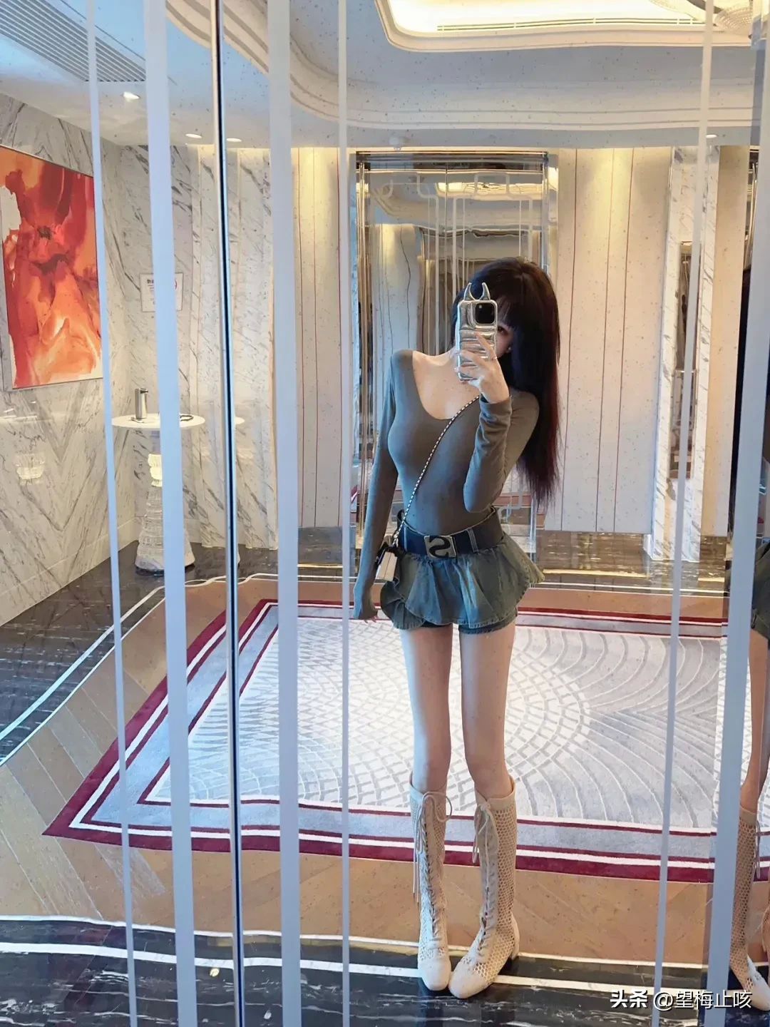 她的穿搭极具时尚感。上身是一件简约的深灰色修身长袖,恰到好处地贴合身形,既展现出优雅的气质,又不失时尚感。腰间系着一条带有醒目字母标志的黑色宽腰带,瞬间为整体造型增添了一份个性与不羁。下身搭配的是一条牛仔短裙,独特的荷叶边设计,让原本普通的牛仔裙变得俏皮又时尚。脚上那双米色的长筒靴,不仅拉长了腿部线条,更增添了几分帅气与洒脱。斜挎着的精致小包,黑白配色经典又时尚,为整体造型画上了完美的句号。