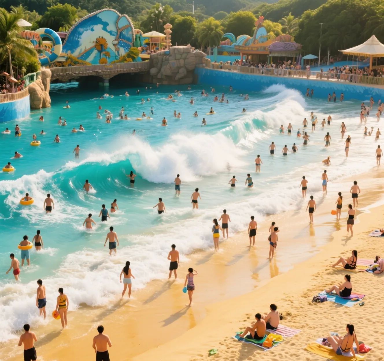 - 超级造浪池:9种海浪轮番上阵,在沙滩区踩踩水、晒晒太阳,累了还能看精彩表演,仿佛置身海边度假~