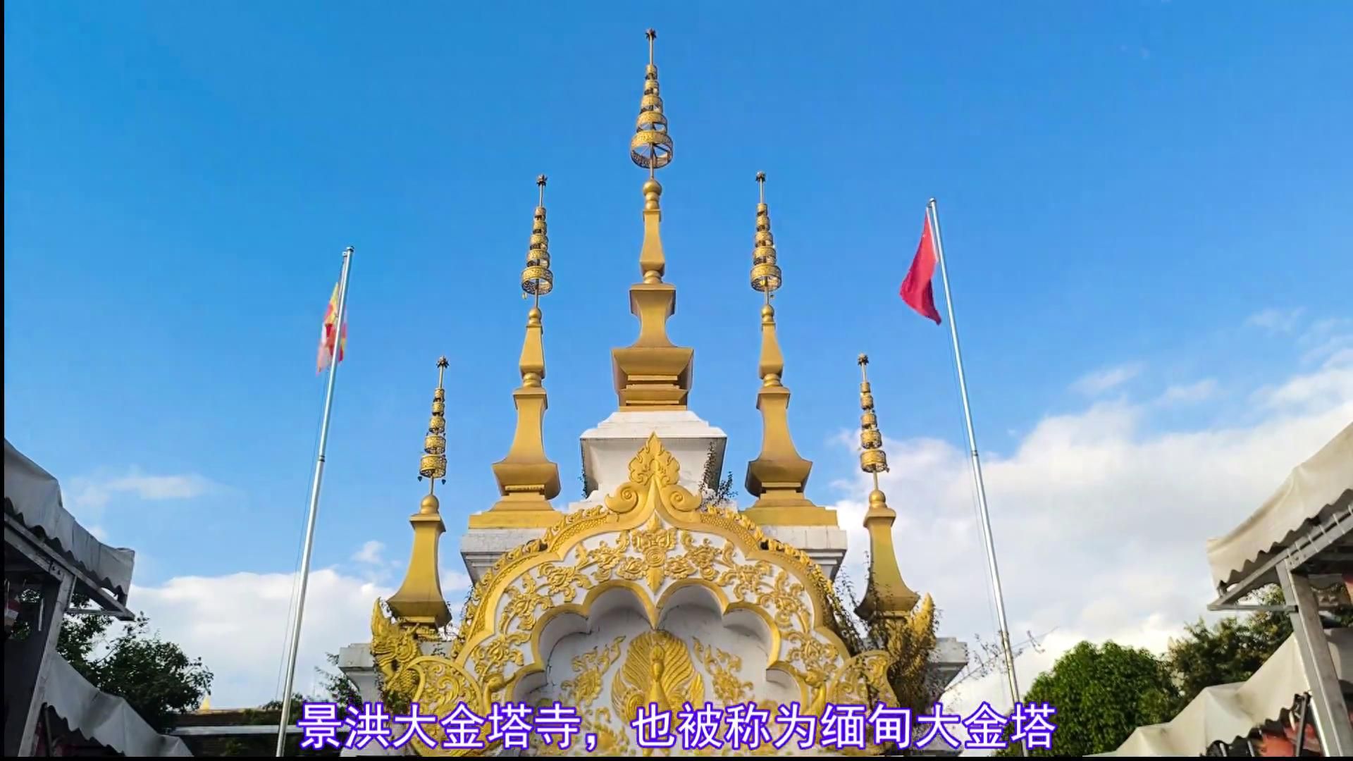 景洪大金塔寺也被称为缅甸大金塔,位于西双版纳景洪市告庄西双景,建筑面积四千零八十六点五四平方米。大金塔寺始建于二零零九年,建筑风格独特,金碧辉煌。大金塔塔身高六十六点六米,寓意一江连六国,继中国、缅甸、老挝、泰国、柬埔寨和越南。
