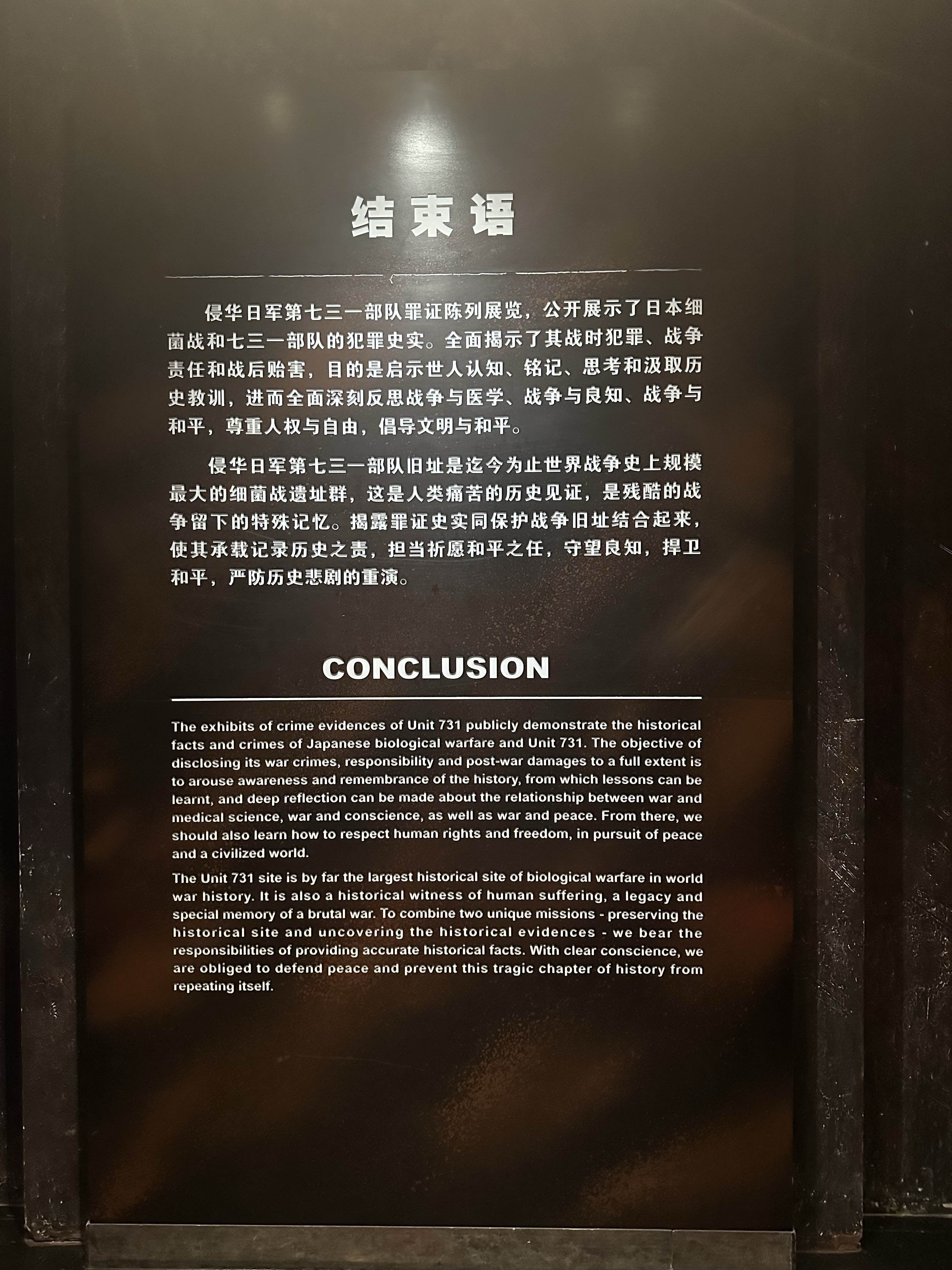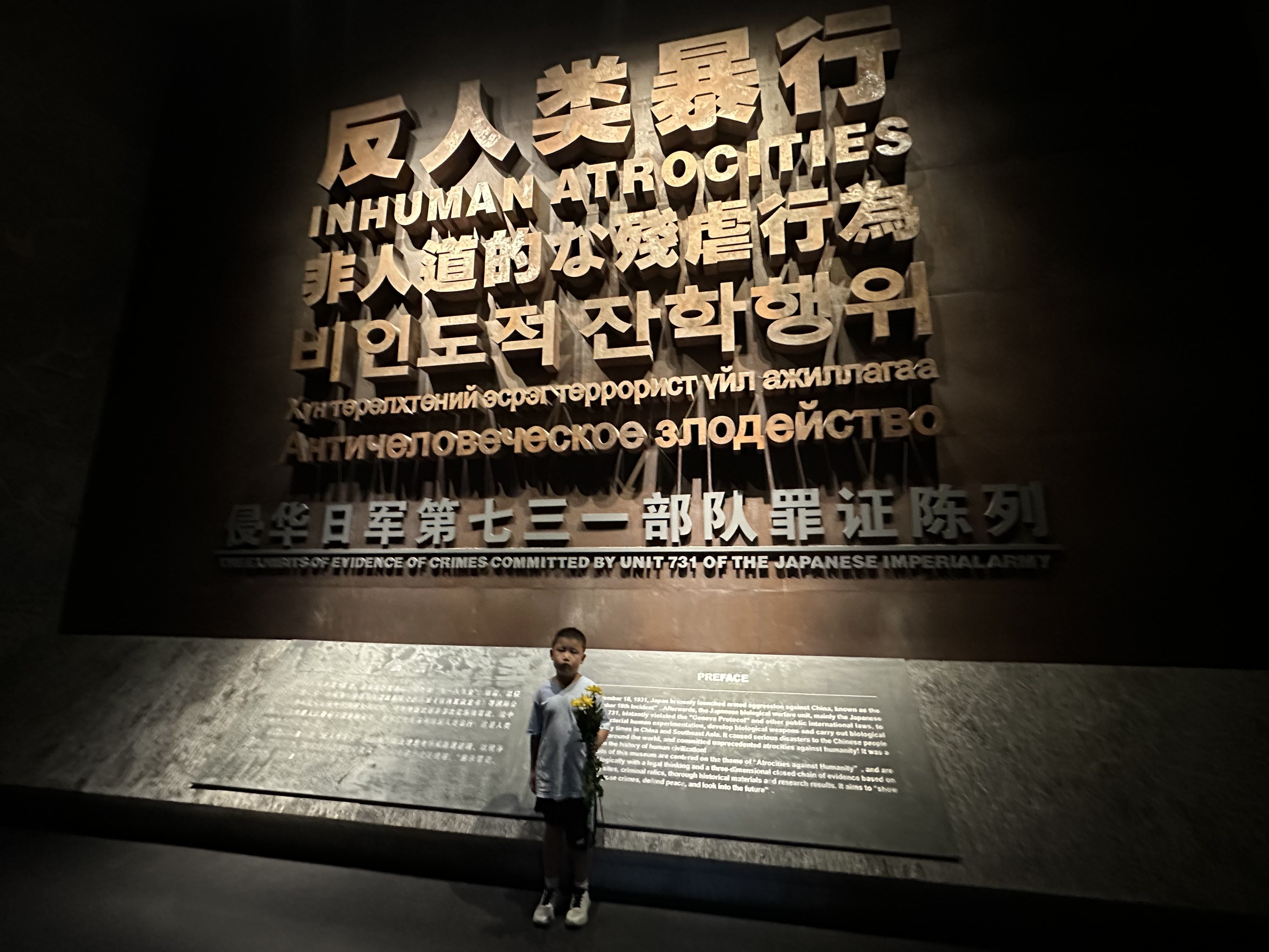 中午吃了东西,下午就去了侵华日军第731部队遗址。因为没有预约,从网上也做了攻略,就在停车场硬等了1个半小时,最后又在里面转了一个小时,当时在等待的时候就买了三朵菊花,全程等待的时候就一直拿着,转到后面的场馆让孩子亲自送上,以此来祭奠牺牲的先辈们。以前总在网上看到那些731部队的各种劣行,今天走进场馆确实有种压抑感。建议去那里的同志们租个讲解器,可以让我们更好的了解那段历史[蜡烛]今天是很有意义的一天,不光让孩子努力学习的同时,还要让孩子勿忘国耻牢记历史!最后今晚还是吃了东北特色铁锅炖,量太大,根本吃不完,味道也相当好,明天最后一天在哈尔滨了,期待明天[爱慕][爱慕][爱慕]