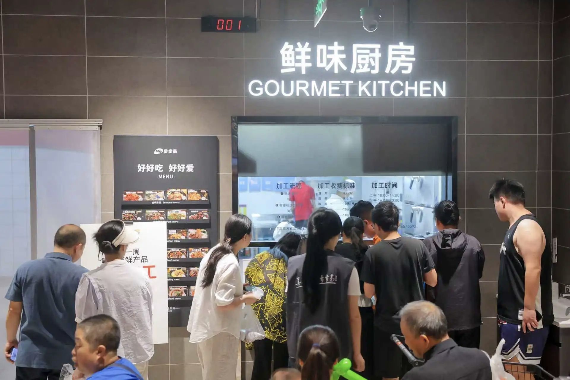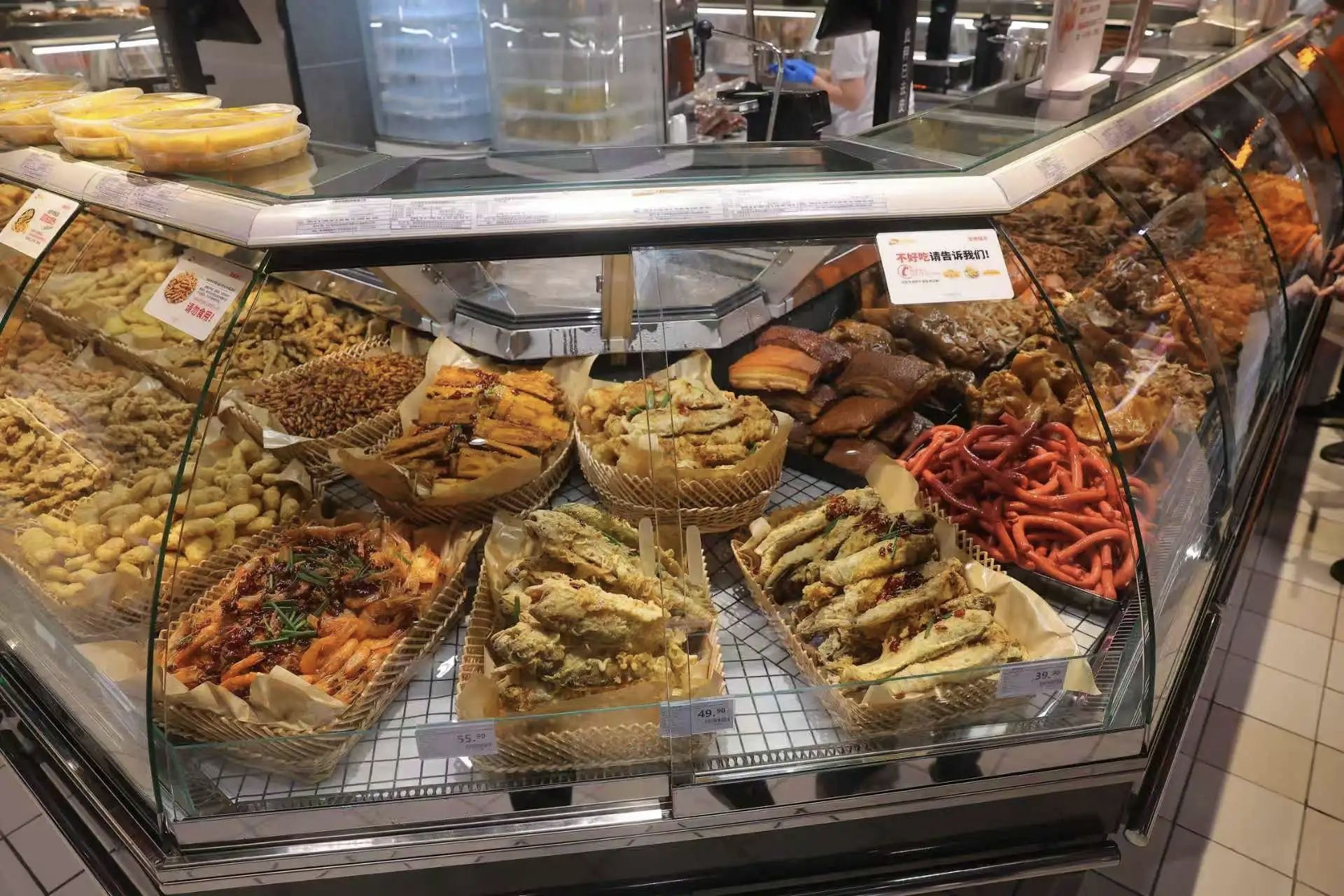 生鲜板块是此次调改核心,熟食区采用明档操作,提供“胖东来同款”小红肠、秘制牛肉条等试吃体验,香辣虾尾、韩式炸鸡等本地特色菜品每日新鲜出炉。水产区引入帝王蟹、波士顿龙虾等高端品类,新增“吊水鱼”可扫码查看检测报告。鲜味厨房支持现场挑鱼、现场加工,开业首周海鲜免费加工。肉类区涵盖中粮亚麻籽猪、流沙河花猪等多元品类,净菜、火锅菜、果切等加工品优化升级,果切超4小时八折、8小时下架。