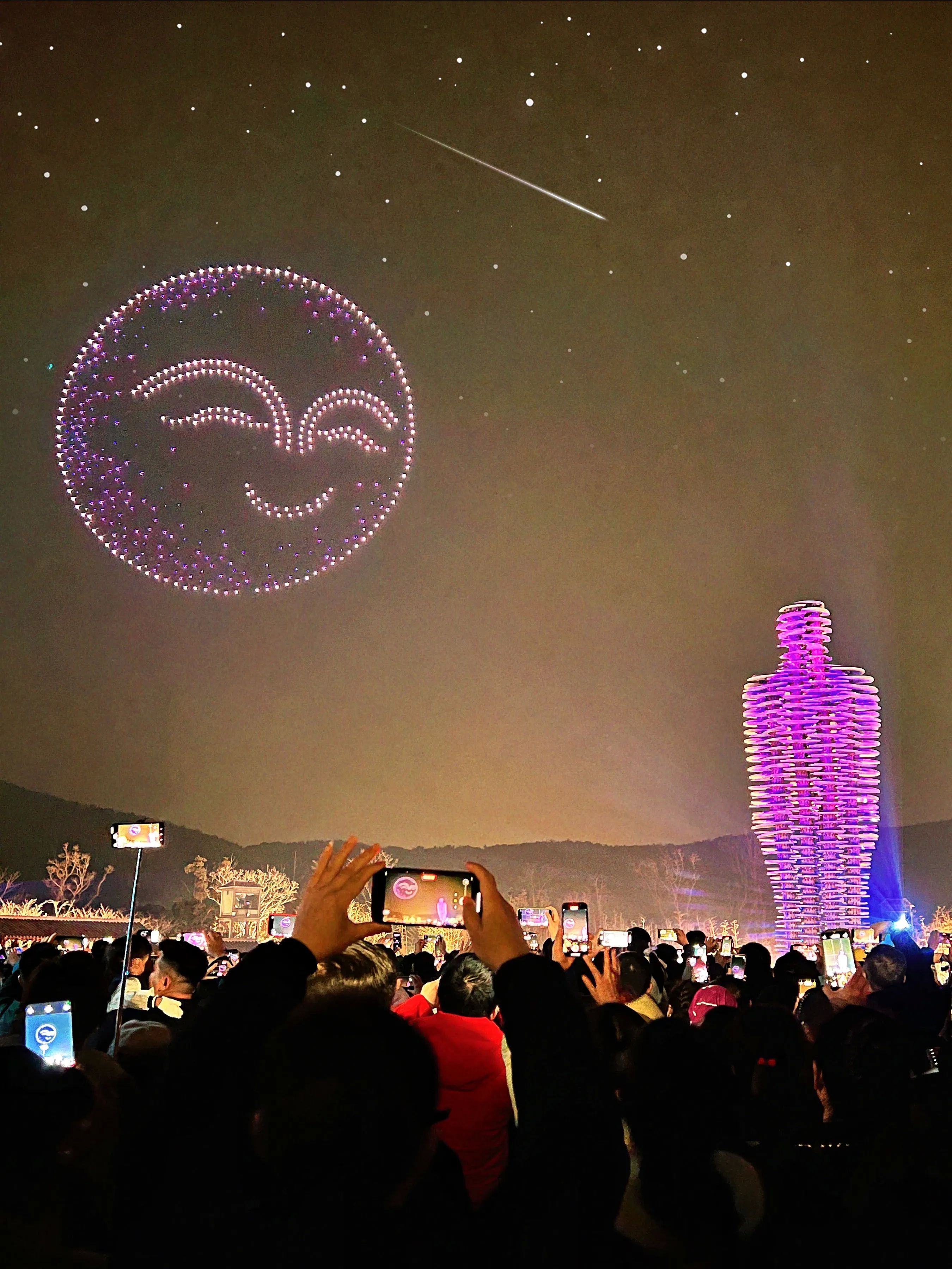 让我最期待的就是AI塔的夜间盛典。高达18米的塔身由光影与数字代码构建,时而幻化莲花,时而流转星河。300架无人机腾空而起,在夜空中绘出“花开满城”的图腾,烟火如瀑布倾泻,与AI生成的动态禅意画卷交织。表演尾声,塔顶绽放全息投影的拈花手势,寓意“心灯相传”,科技与禅意的碰撞直击灵魂。