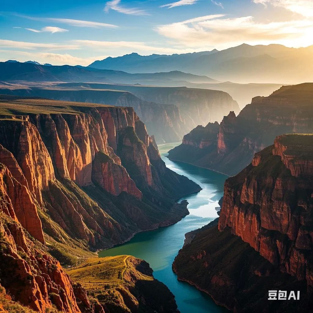 "血红色丹霞峡谷,金色落日穿透嶙峋怪石,干涸河床的龟裂纹理,孤独旅者剪影,科幻电影氛围,暗调高级灰,岩壁风化痕迹