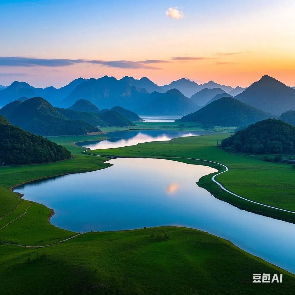 "雨季后的喀斯特湖泊,碧水倒映剑状峰林,牛羊群在青黄草甸漫步,无人机垂直俯拍几何构图,莫兰迪色系,水面镜面反射"