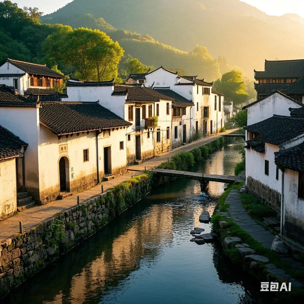 "清晨薄雾中的徽派建筑,千年香樟树穿透马头墙,锦鲤在青石板溪流游动,老妪浣衣水花飞溅,水墨画留白意境,柔焦处理"