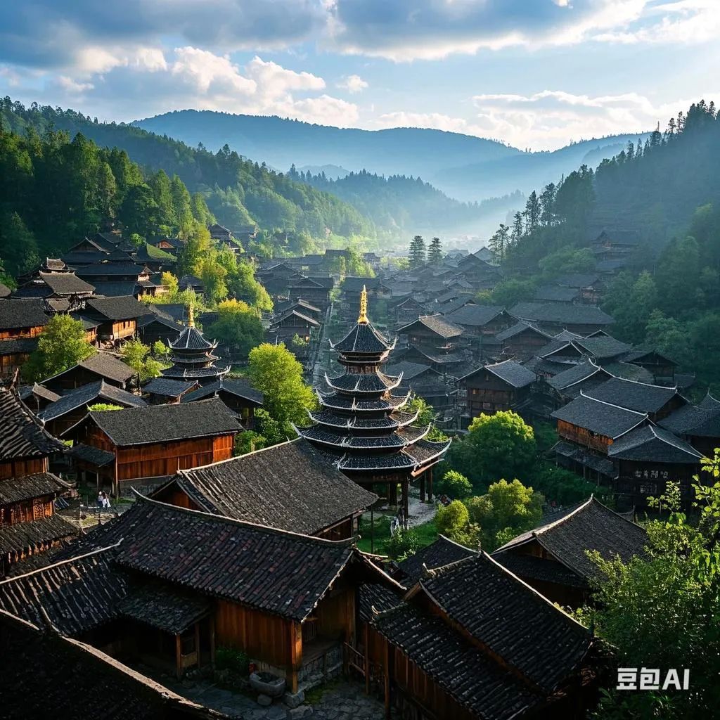 "晨雾中的千年榉木鼓楼,侗布晒场彩虹色布匹,老人用牛角梳纺线,建筑榫卯结构特写,人文纪实风格,温暖晨光侧逆光"#让心醉美景#