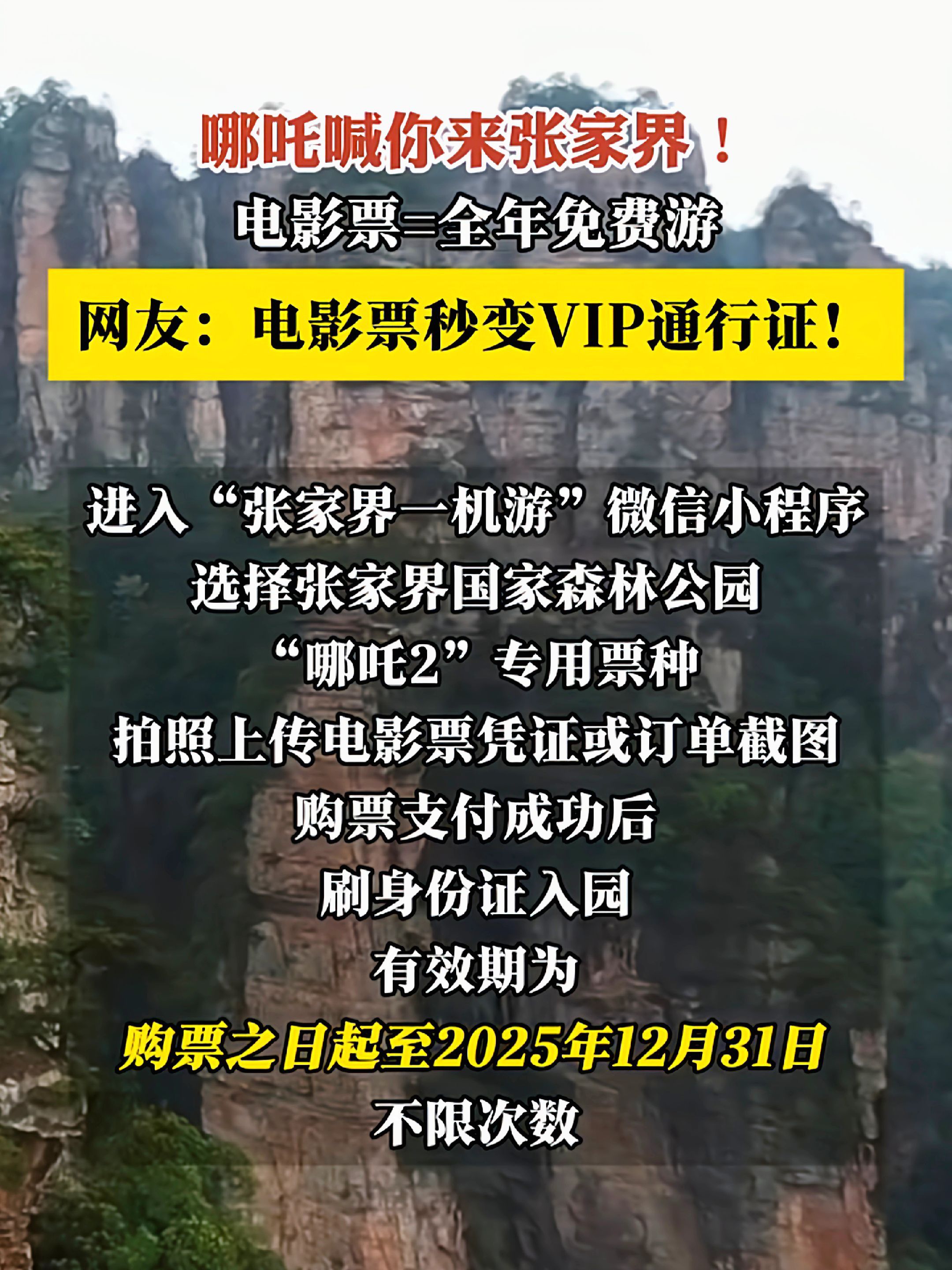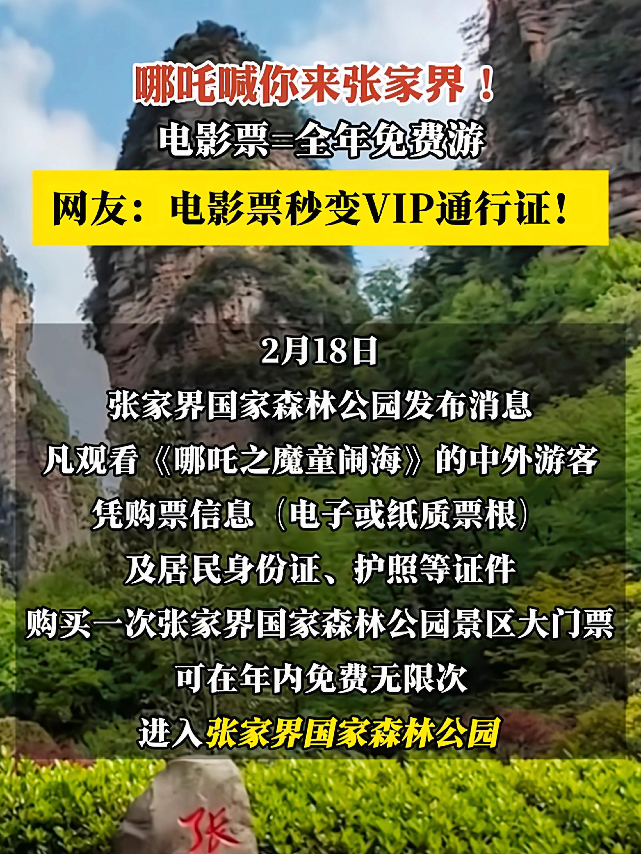 看哪吒2,免费一年内无限游玩张家界!大优惠凡观看哪吒之魔童闹海的中外游客