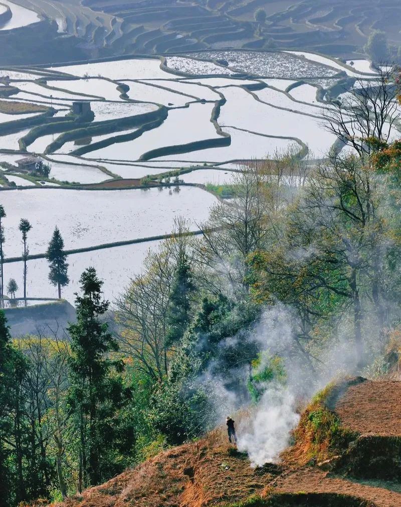 灌水期的梯田像镶嵌在山间的镜子,日出时云雾缭绕,妥妥的“摄影佬天堂”。多依树看日出,老虎嘴追日落,手机内存告急预警!