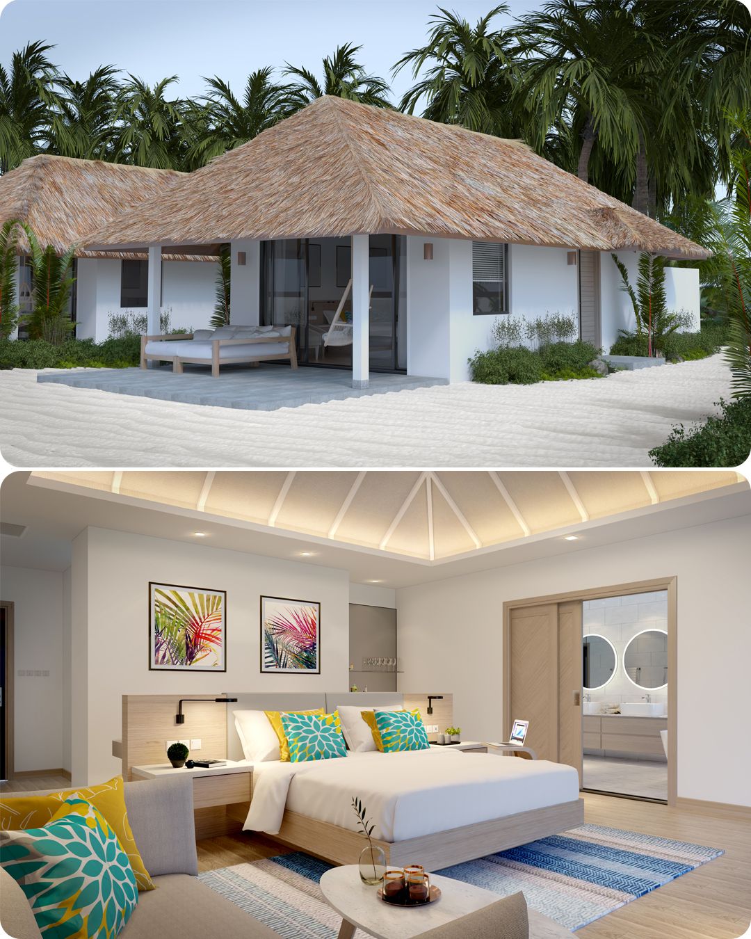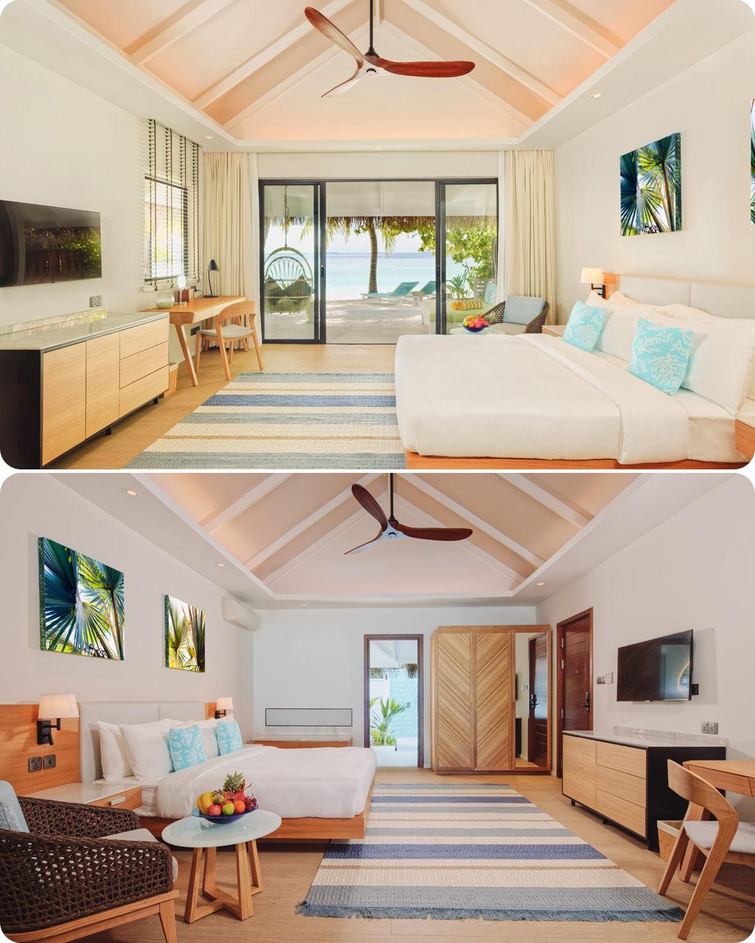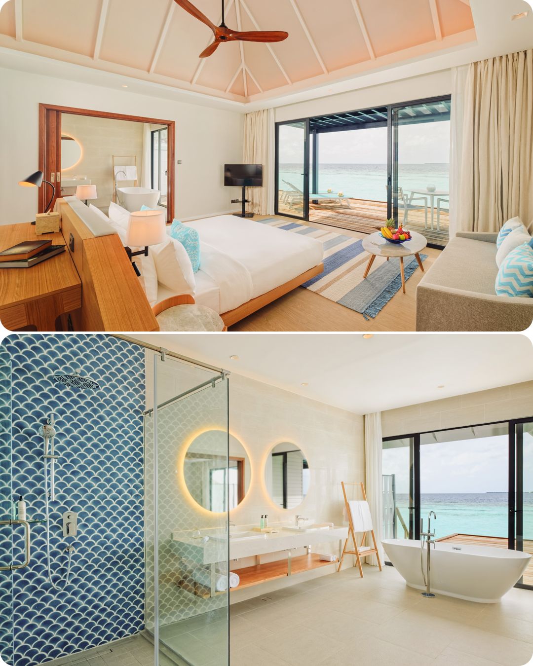 • 全岛76间豪华客房,其中沙屋51间,水屋25间,共有10种房型可选,房间采用极简明亮风,非常符合年轻人审美;