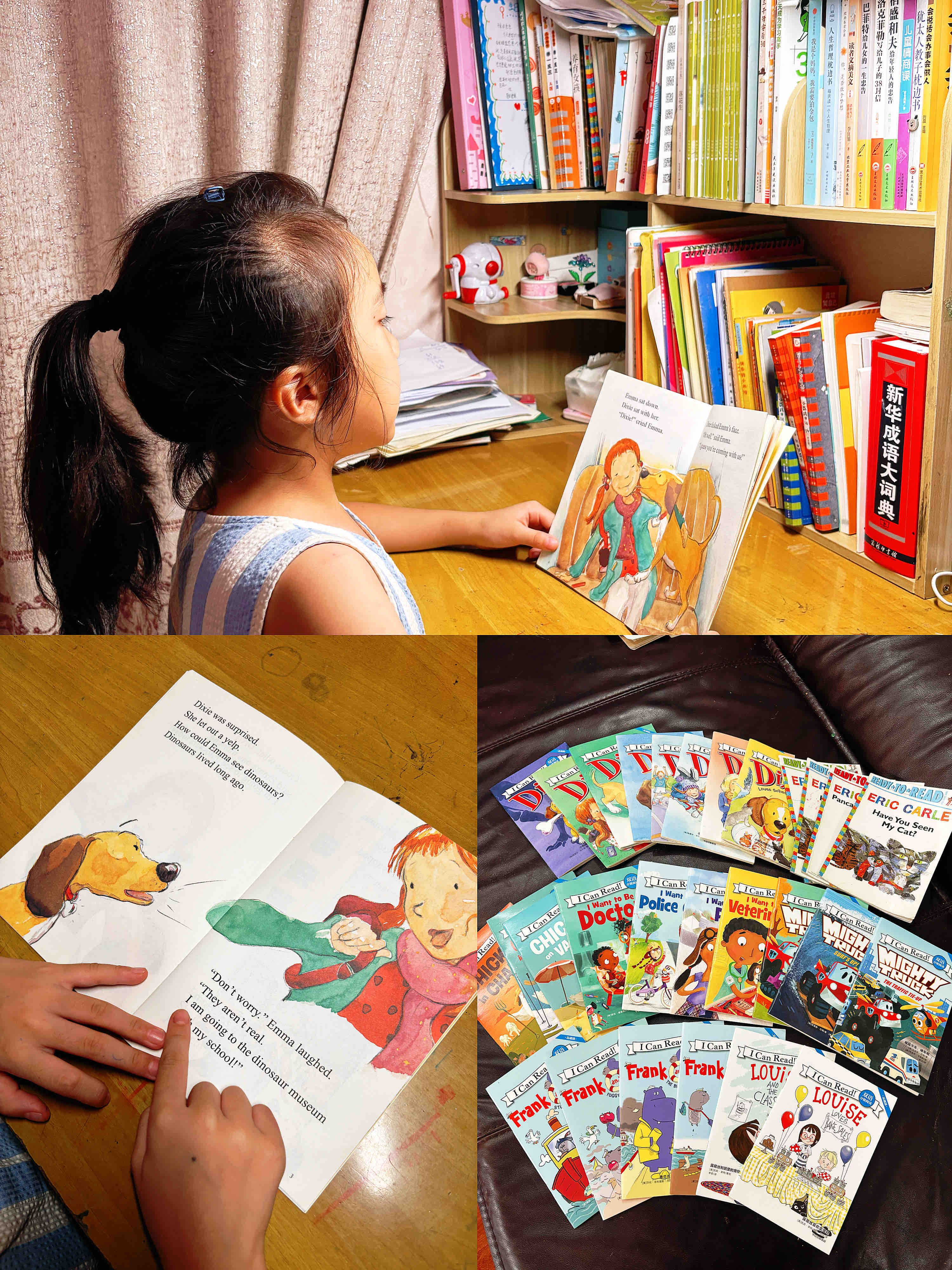 第五阶段,今年5月初,我们终于刷完了140本电子绘本阅读。开始进入纸质绘本阅读,我当初买的那些英语绘本终于派上用场了。无论是词汇量、还是内容,纸质绘本都难了不少。每本先听一遍,跟着读一遍,我在旁边纠正一遍,然后她完整朗读一遍。前5本,读的很慢,大概两天完成一本。5 本之后,速度快了很多,可以完全自己阅读了。