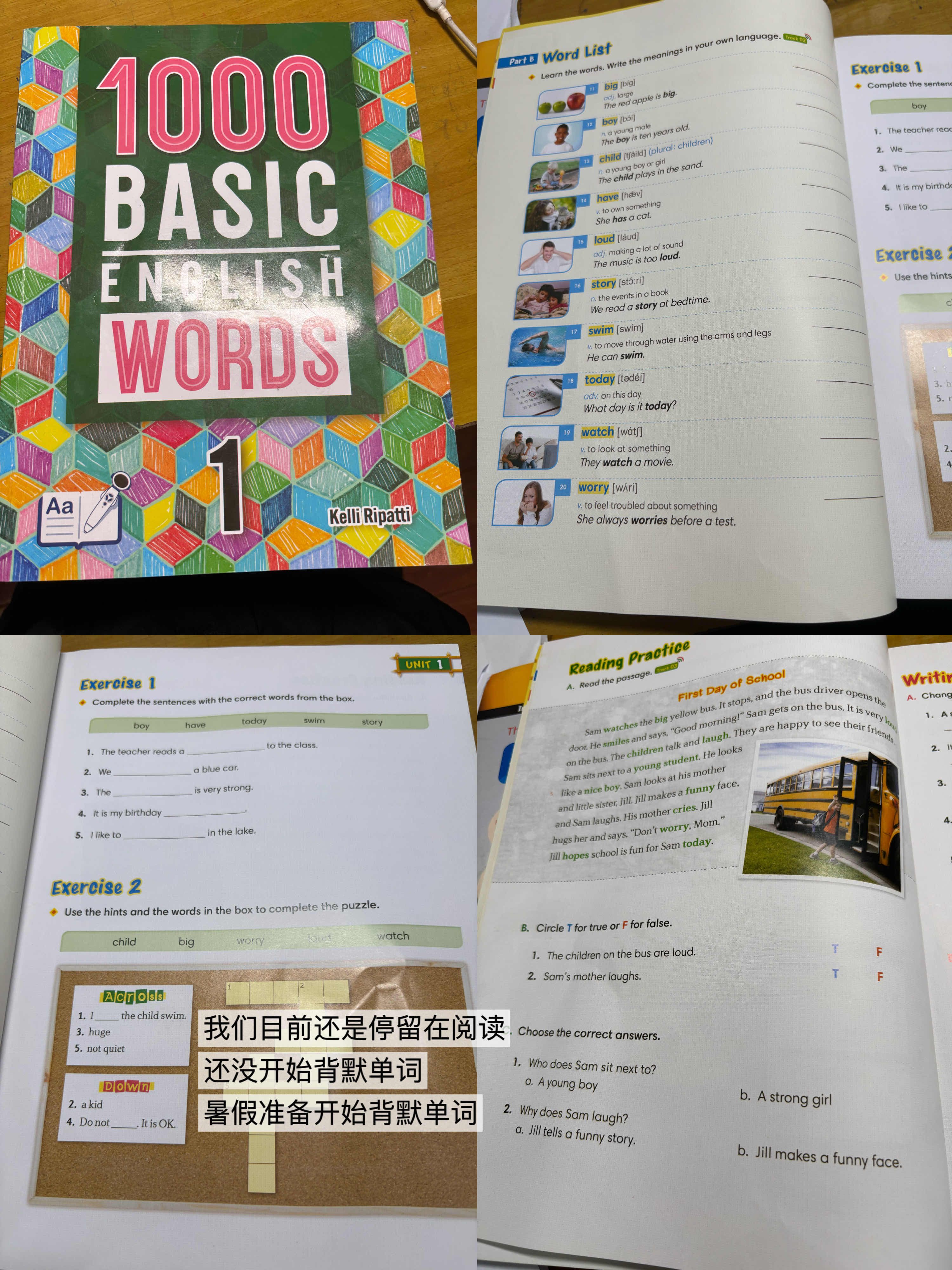 第二步,翻各种视频,下单了一本自然拼读的书。书回来后,我自己学了一遍,练习的差不多了,就开始教女儿。一页单词读几遍,读音标和单词,只要读会就迅速过到下一页,每天十来分钟。坚持两个月后,开始拼读,除了音标拼读,我还要求记忆式拼读,比如what,要这样读:w-h- a -t…… what,这样加深对单词的记忆。一本单词书,就这么坚持读了大半,才开始进入绘本阅读。