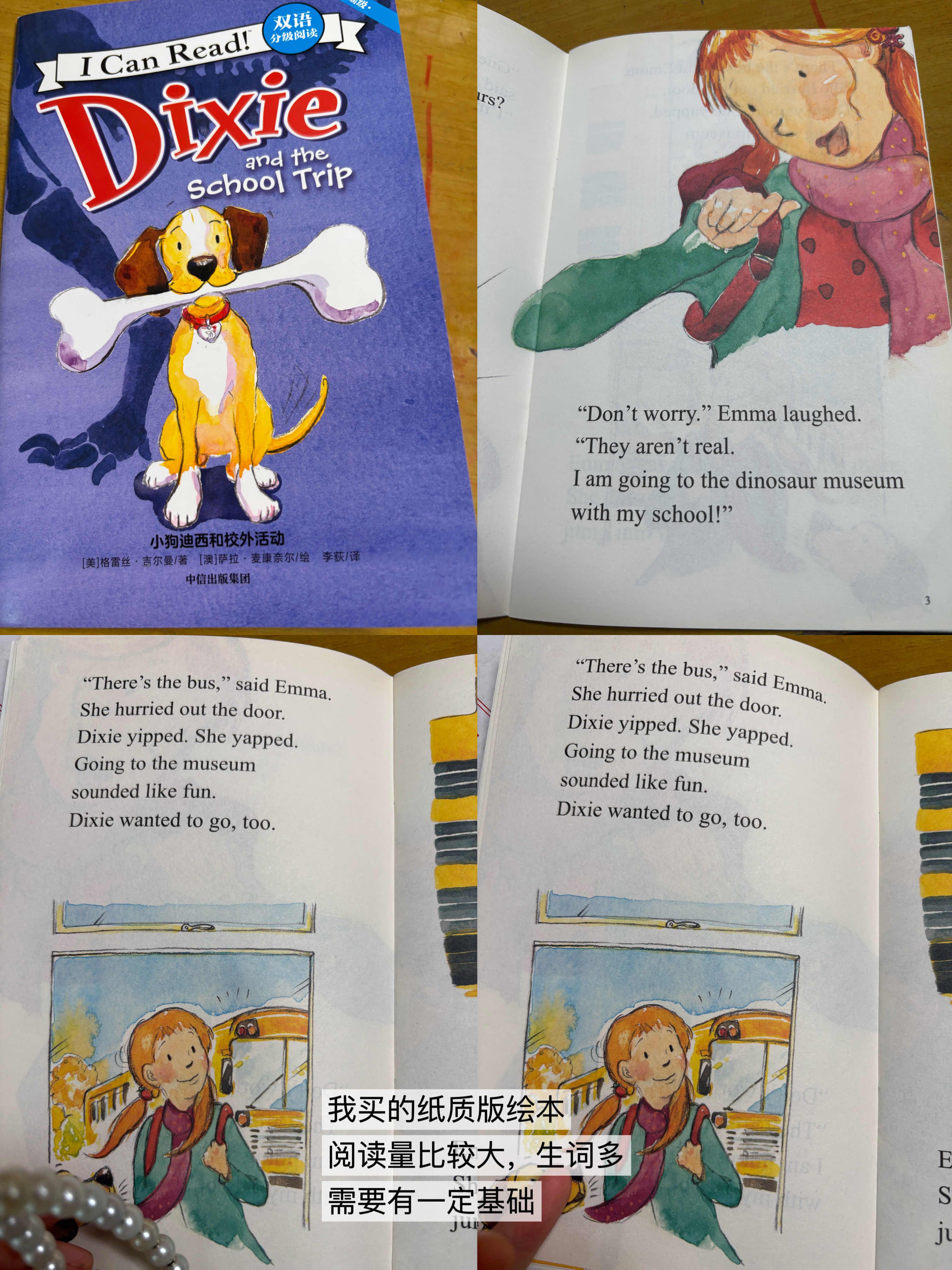 第二个成果就是,可以自主阅读绘本了,如《小狗迪西》;遇上陌生单词,能尝试自己拼读,虽然并不是全部能读准确,但是听完一遍音频,一本30页左右的绘本,基本可以朗读出来。
