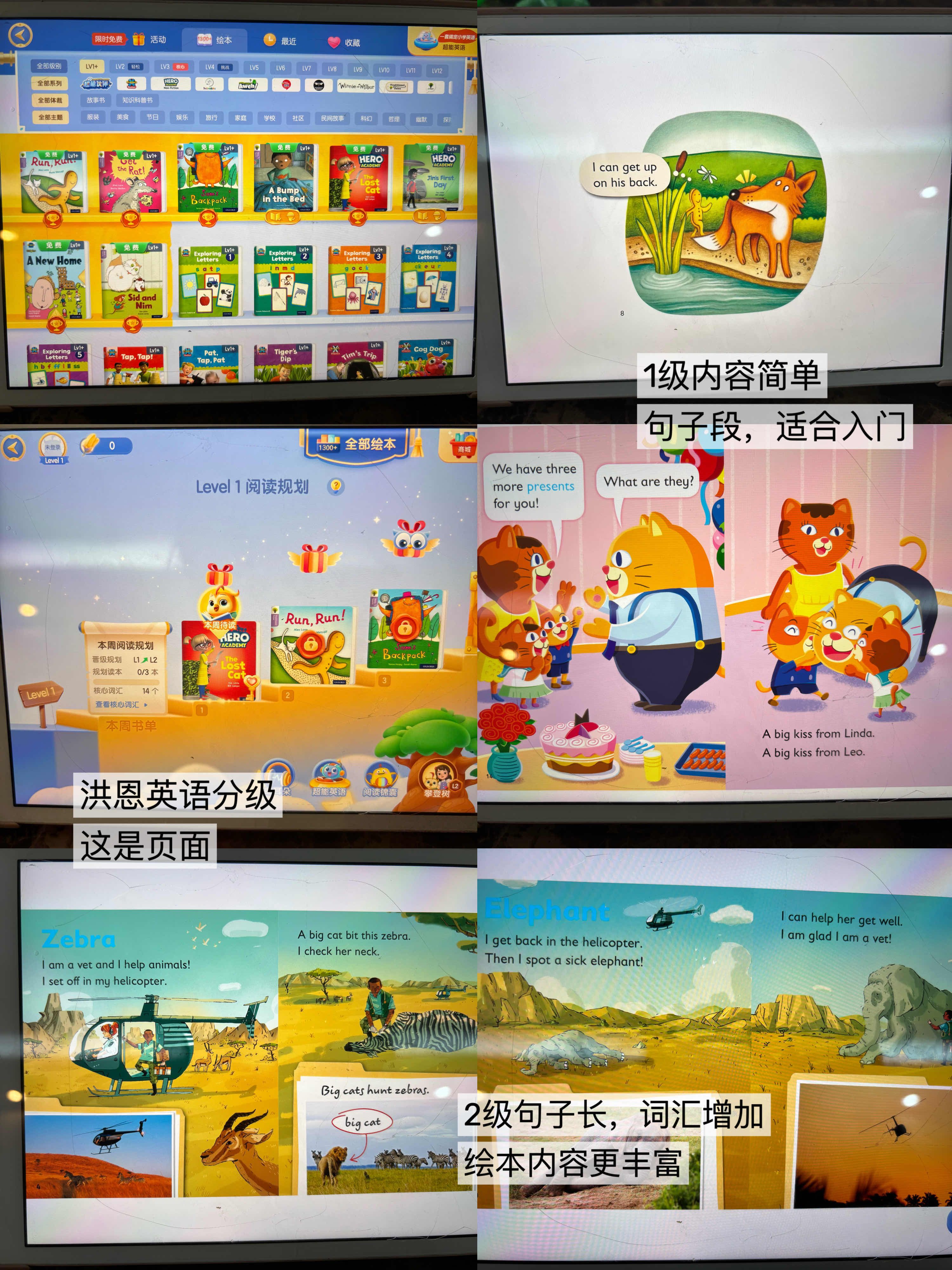 第三步,绘本阅读。我买的绘本阅读还是难,忽然想到有没有什么电子英语绘本?最终找到了洪恩分级阅读。初级阶段果然简单,每本10页以内,每页一句话,句子简单,包含讲解、朗读、听读、跟读几种模式。我一句句教,教完让孩子跟着读,然后听着语音跟读一遍。就这样每天坚持,直到把第一阶段70本刷完。