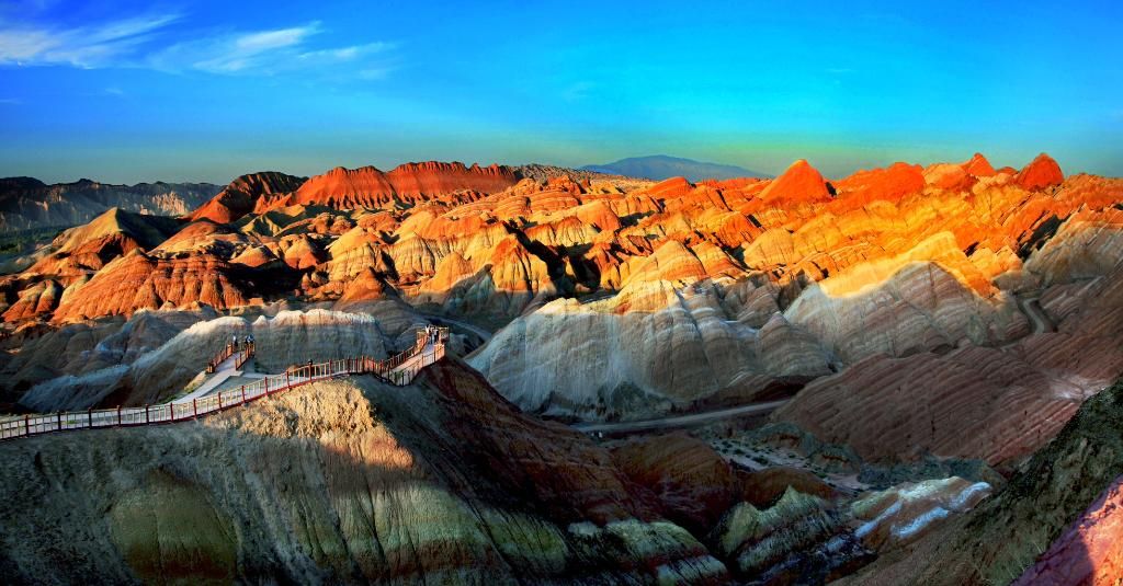 - 张掖七彩丹霞:位于张掖市临泽县倪家营镇南台村,是白垩系下统砾石、砂岩和泥岩组在新构造运动控制下,由水流冲蚀和风蚀共同作用形成的地质遗迹 。这里的丹霞地貌以五彩斑斓的山峰著称,红橙黄绿蓝紫等多种颜色交织在一起,仿佛是大自然的调色盘,有明显的干旱、半干旱气候的印迹,以交错层理、四壁陡峭、垂直节理、色彩斑斓而示奇,是中国最美的七大丹霞地貌之一 。