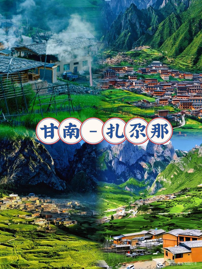 - 扎尕那 :位于甘南藏族自治州迭部县益哇乡,藏语意为“石匣子”。这里山势奇峻、景色优美,犹如一座规模宏大的石头宫殿。扎尕那是一个藏族村落,半山坡上藏式榻板木屋鳞次栉比,层叠而上,嘛呢经幡迎风飘扬。村庄四周都是奇异山峰,从迭山高处俯瞰,既像一座巨型宫殿,又似天然岩壁构筑的完整古城,岷山、迭山纵横交错,山高谷深,白龙江干流自西向东贯穿全境,特殊的区位造就了独特的自然与人文景观,有“人间仙境”的美誉。