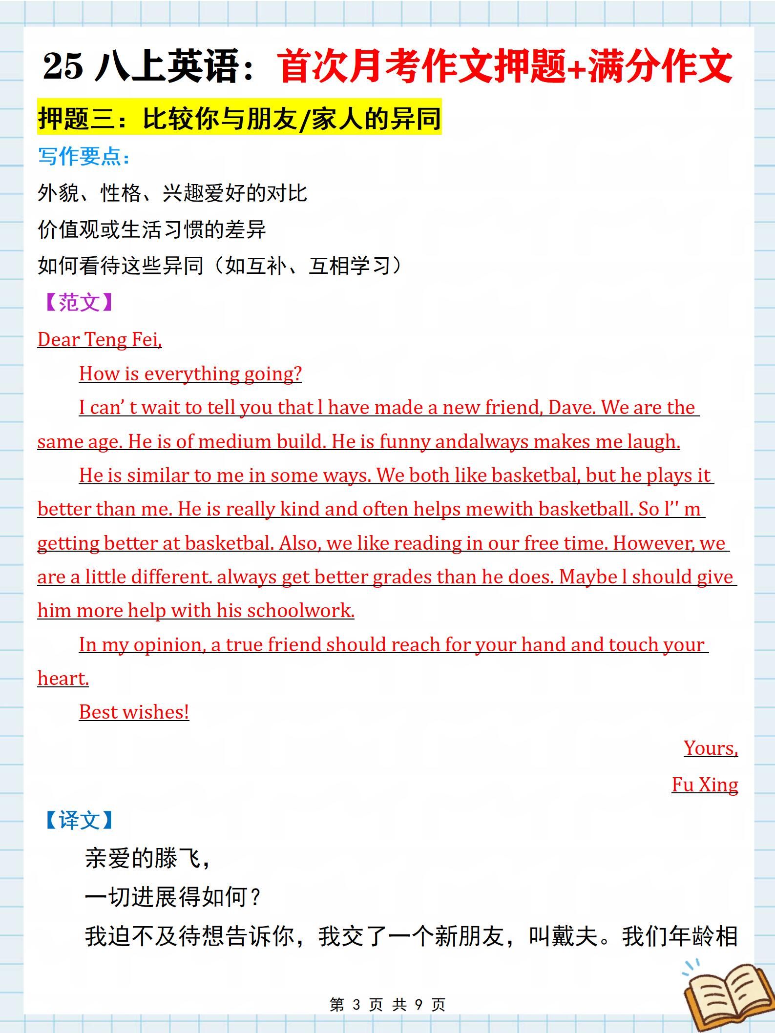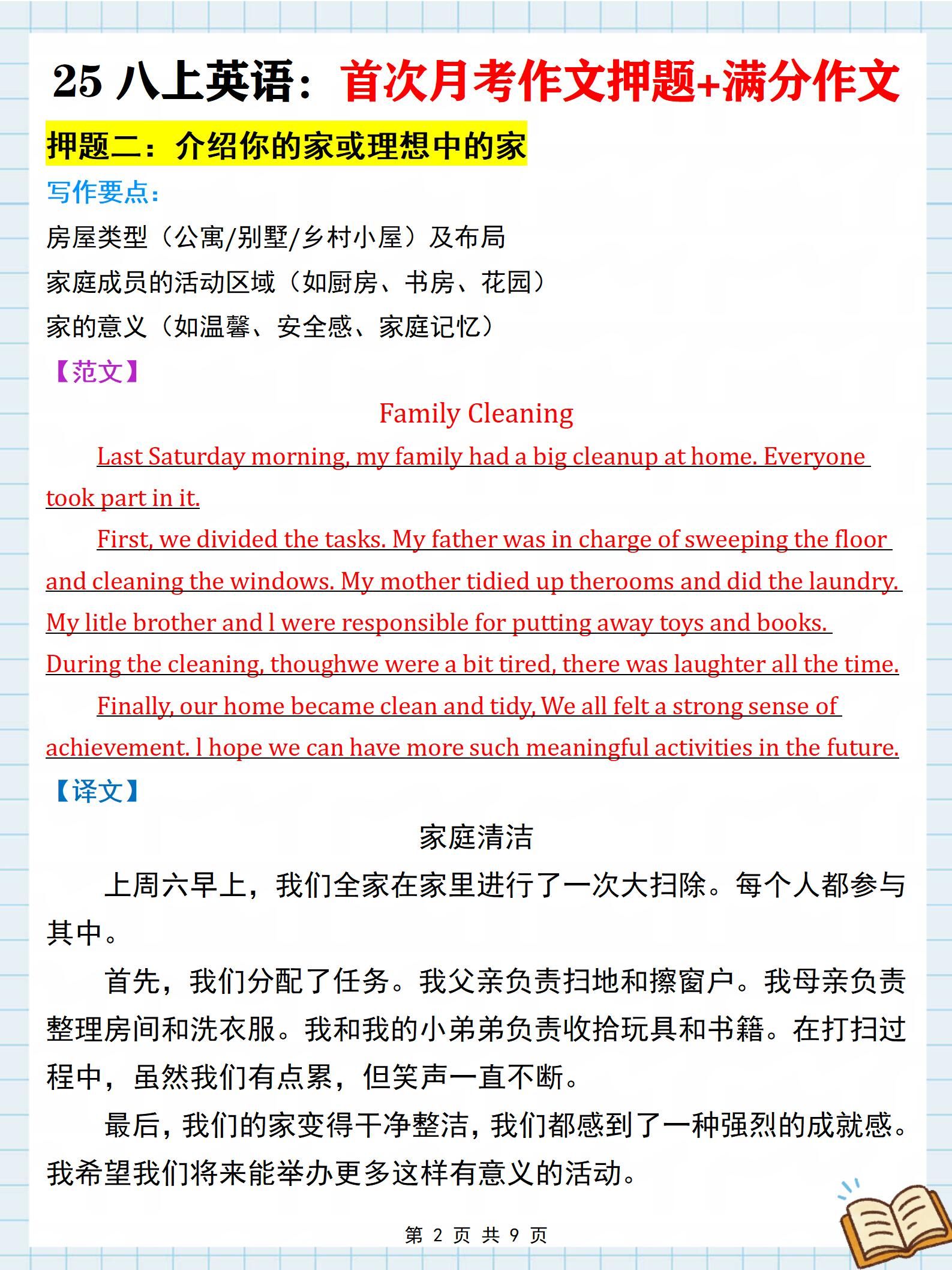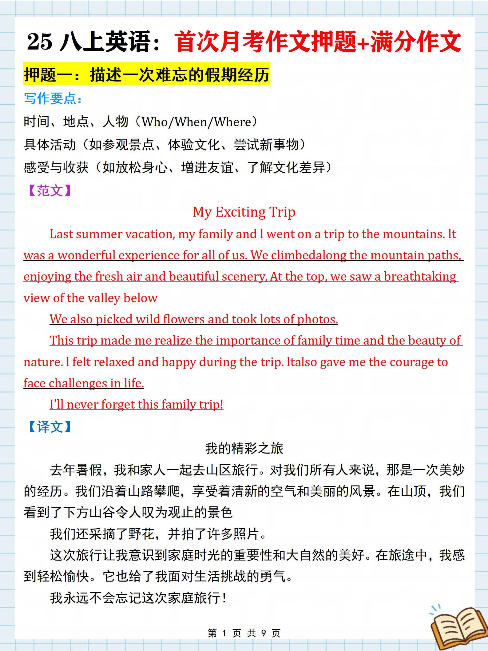 25新八上英语单元写作范文及指导,针对每个单元写作话题,明确写作要点,如“描述一次难忘的假期经历”需涵盖时间、地点、人物、具体活动及感受收获。同时提供优质范文参考,让学生在学习范文结构、语言表达的过程中,逐步提升写作逻辑与文采,为月考乃至长期英语写作能力提升助力。
