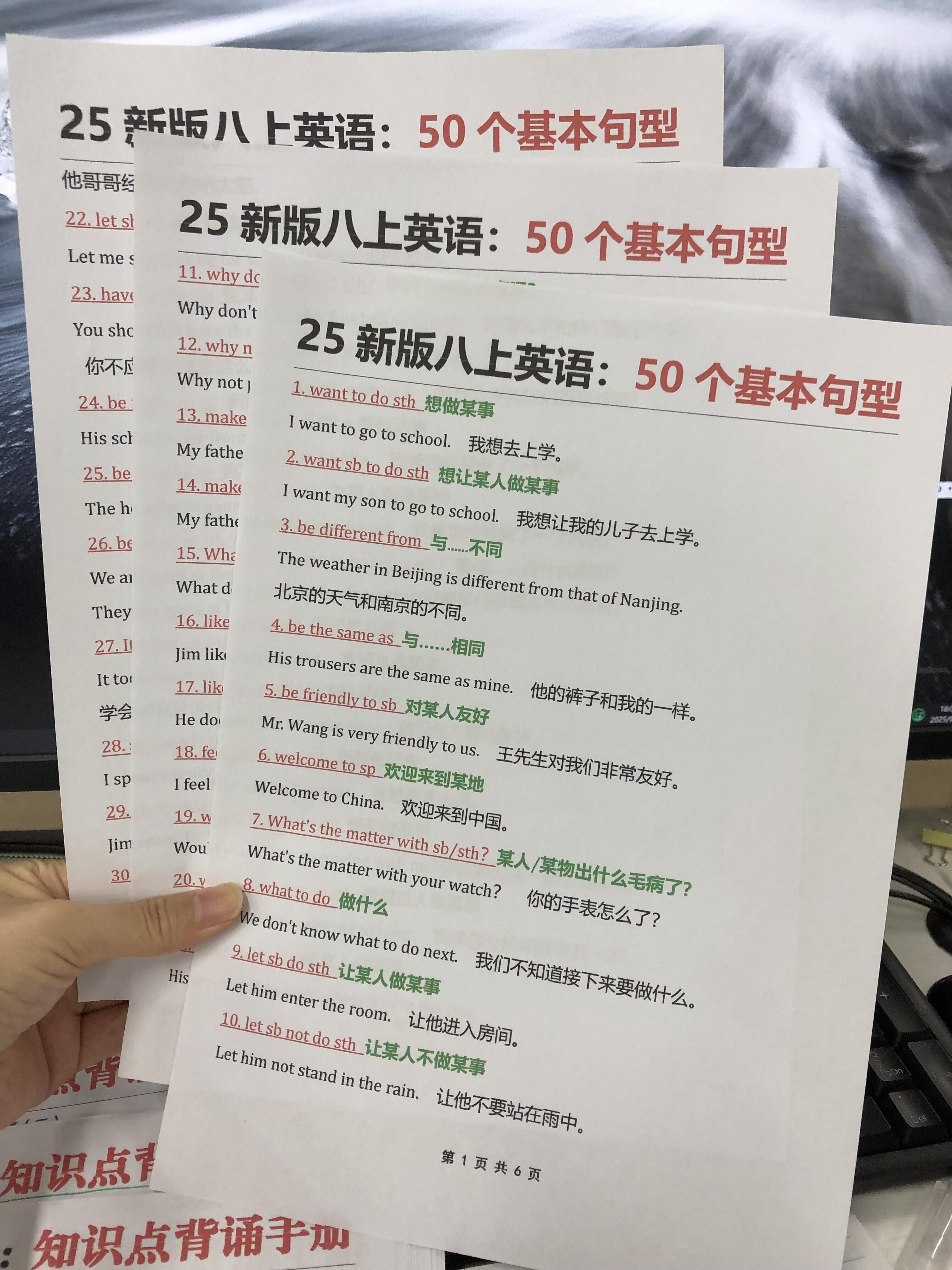 新版八上英语语法知识梳理细致入微,像复合不定代词的类别、用法及考点,都以表格和例句形式清晰呈现;1-8单元重点短语句型全面覆盖,从“go on vacation”到“learn about local culture”,满足日常表达与写作需求;50个基本句型更是将英语常用结构一网打尽,从“want to do sth”到“let sb do sth”,搭配例句帮助学生理解运用,全方位夯实语法与短语基础。