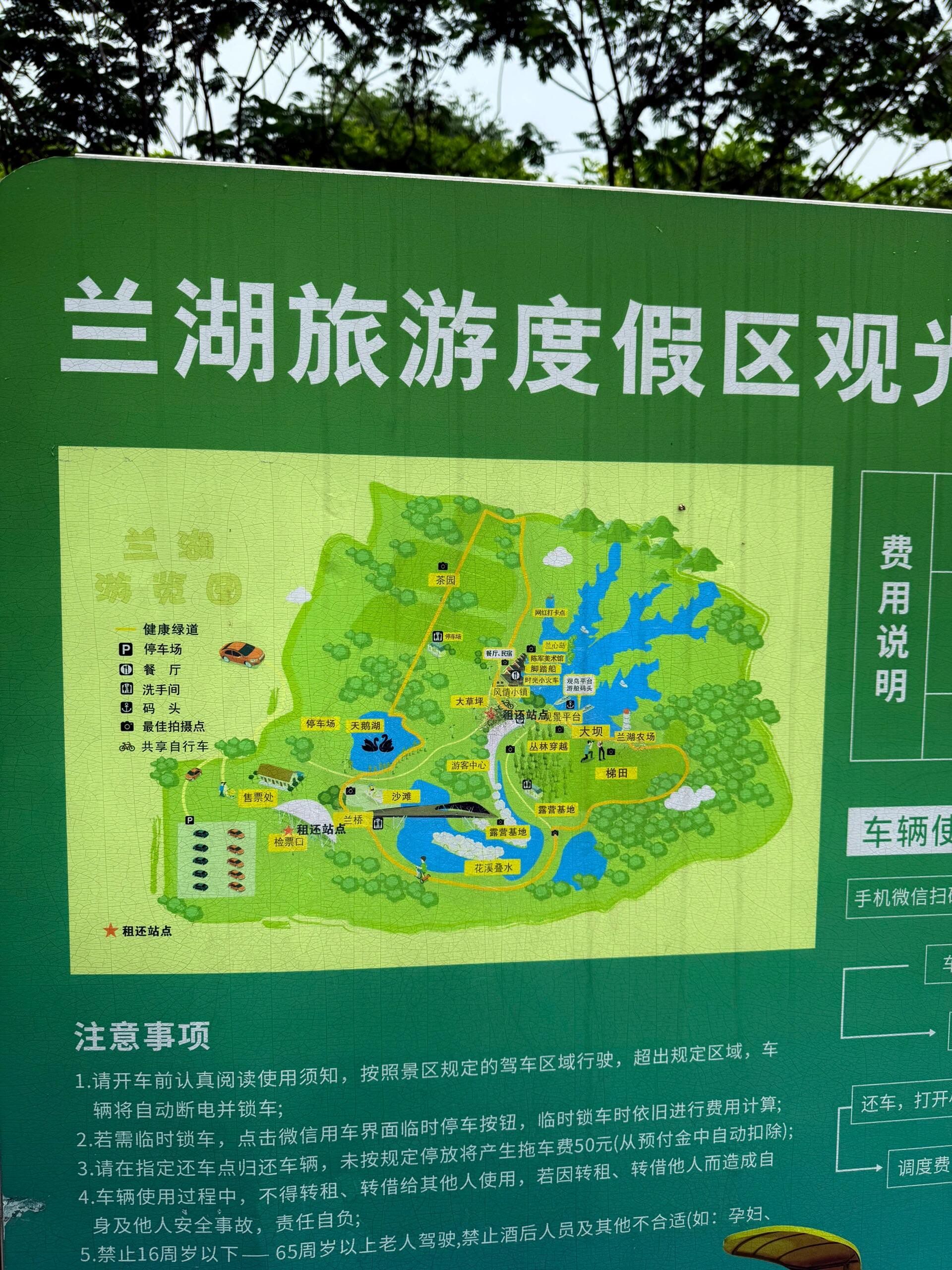 景点:来到兰湖,一定要放慢脚步,好好享受这里的休闲时光。可以先租一辆电动观光车,100元/40分钟,沿着环湖大道行驶,欣赏沿途的美景。湖光山色,绿树成荫,让人心情愉悦。