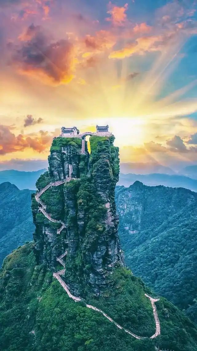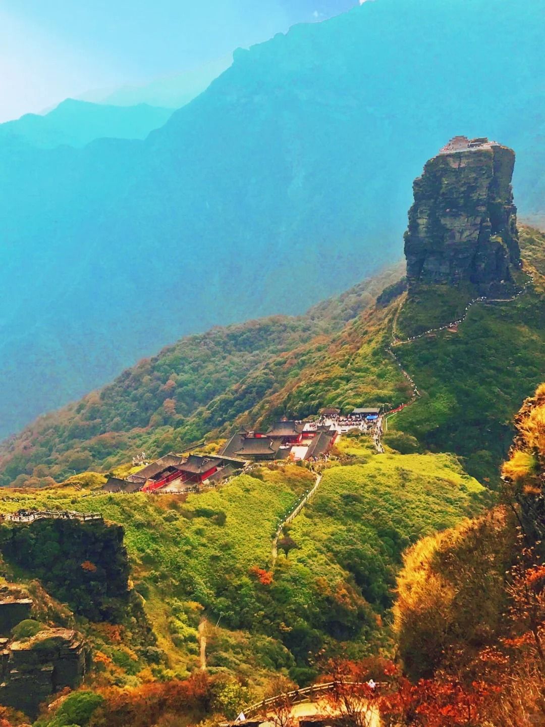 1. 红云金顶:垂直高差近90米,金刀峡将山峰一分为二,天桥连两寺,云雾缭绕时如仙境,航拍/日出时佛光环绕。