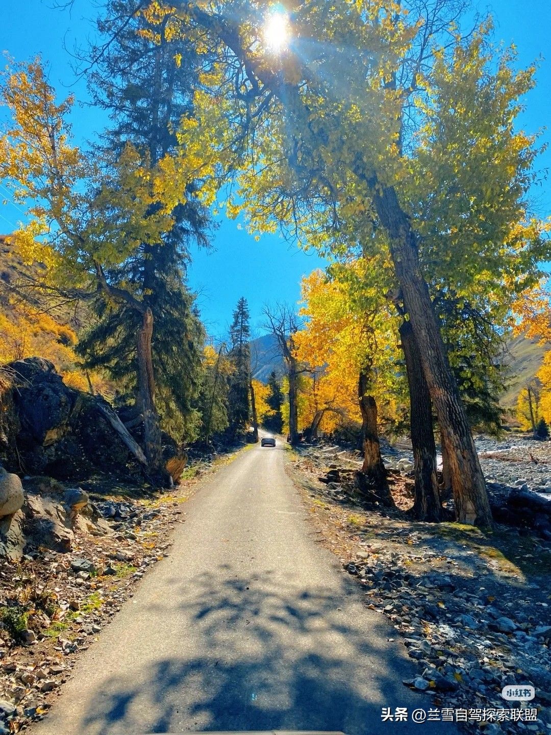 四,导航:新疆保华润天无人机,往前走一百米右转就到达目得地。也叫石人农场,这里是石人沟方向,秋天的季节特别适合。