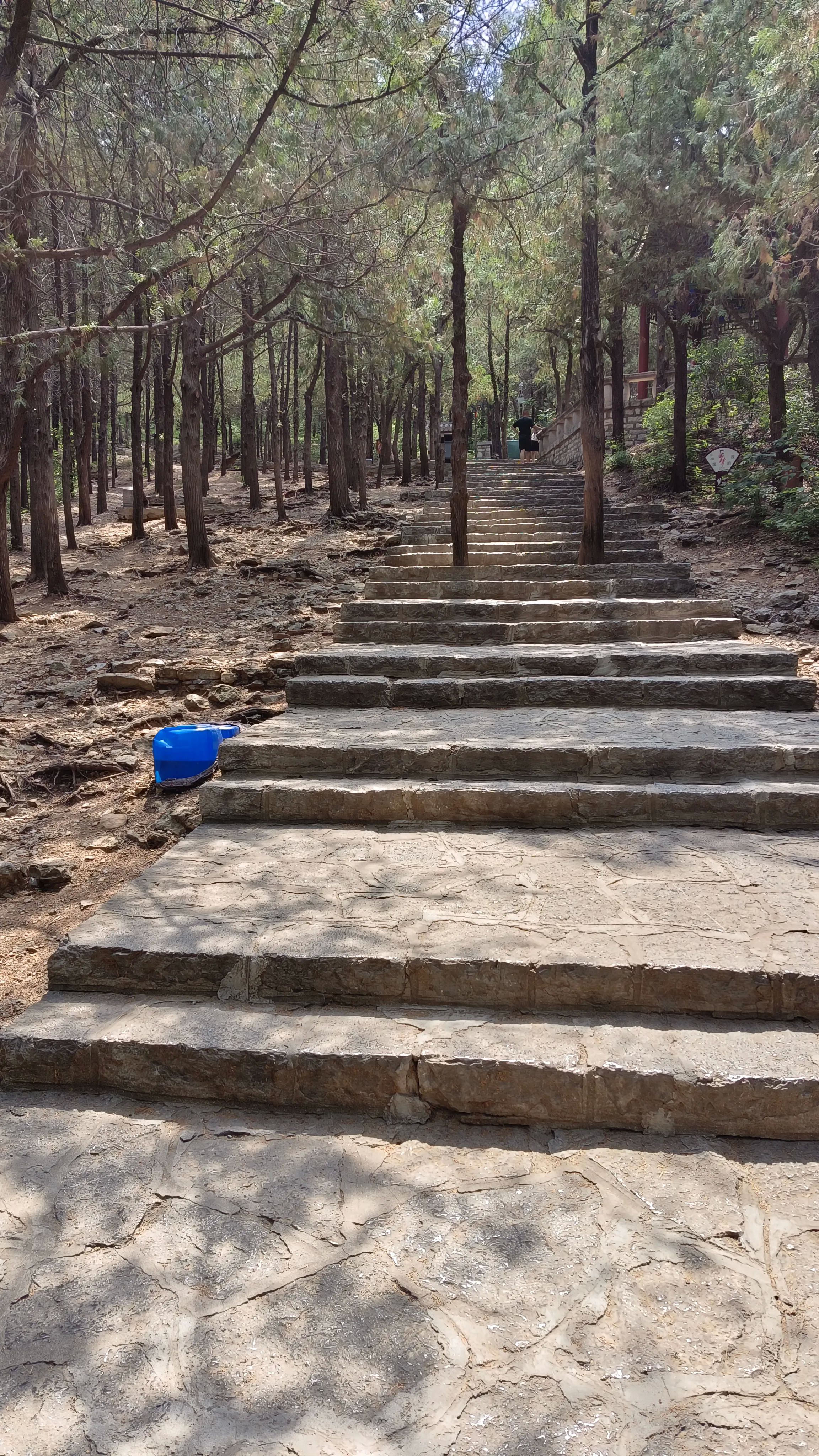 沿着石阶梯开始往上登山了,台阶两边都是茂盛的松树,好久没有锻炼过身体,爬了没一会心脏就开始跳的让我都喘不过气,停停走走,要不是看到一张门票六十元我真的想回去了。