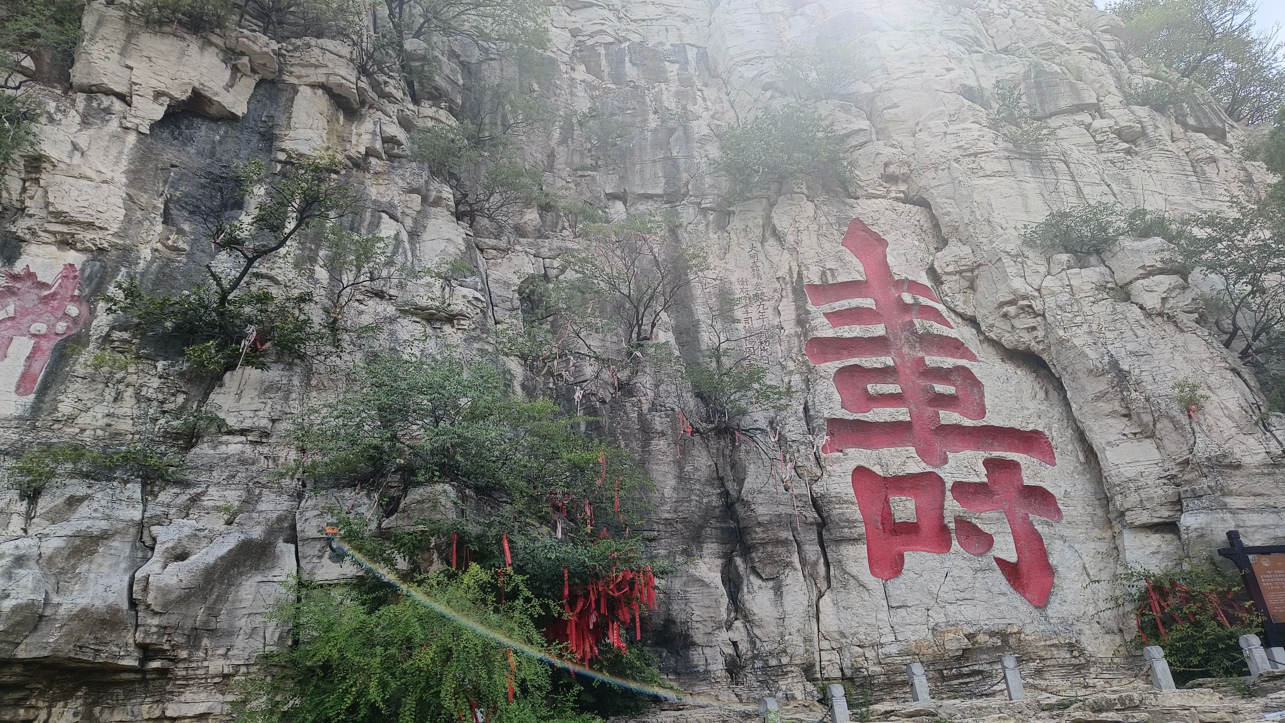 继续努力,累的我真想就地躺着,一路汗水一路心跳,用了一个小时左右终于到达了山顶。一个巨大的“寿”字展现在眼前,字通高7.5米宽3.7米,“寿比南山”的美好愿望也源于此吧。