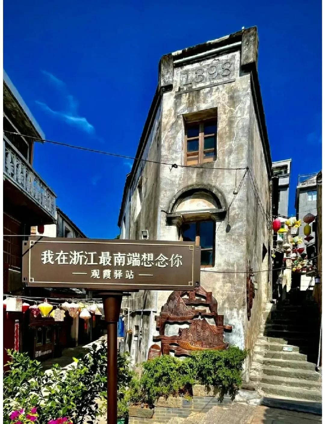 从崇家岙开10分钟就到烟堆岗,这地儿是明朝的抗倭烽火台遗址,米黄色围墙配蔚蓝大海,拍照自带“治愈系滤镜”。虽然咱上午到拍不了日出,但360度环视山海风光也超震撼,站在观景台右侧的突出礁石上拍背影,头发丝都带着光,朋友还以为你去了垦丁