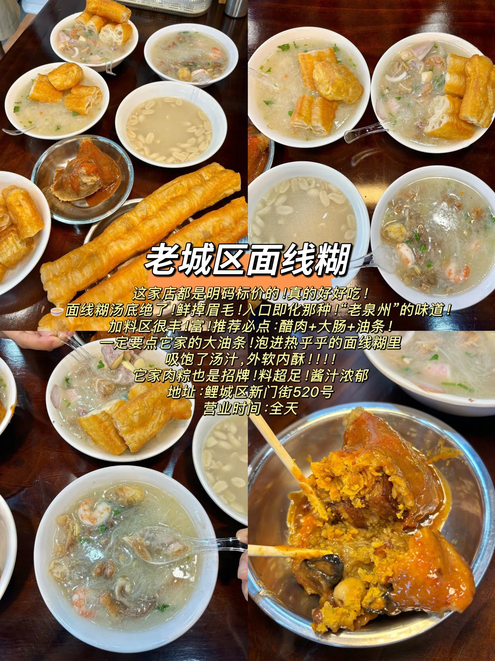 - 必吃:面线糊(推荐21元/碗)、安海土笋冻、闽南炸醋肉、四果汤。