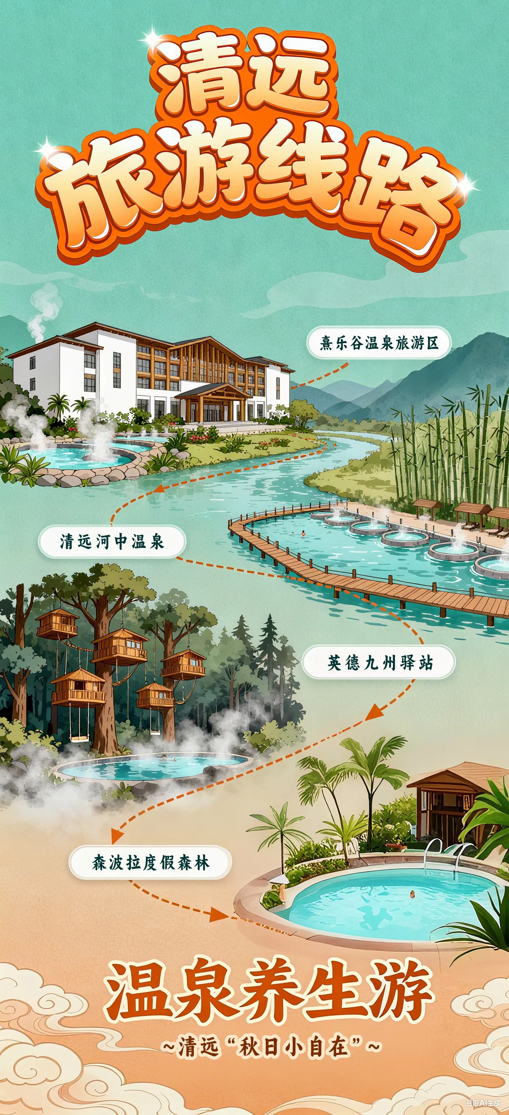 • Day2:前往清远河中温泉,这可是清远首家五星级温泉。在森林绿野的温泉池里放松身心,这里的温泉水富含 “锶”“偏硅酸”,是可饮可浴的天然温矿泉。泉之谷的独栋别墅、森林墅的特色住宿,都能带来独特体验。下午出发去英德九州驿站,入住树屋村,体验树上生活。晚上在树上温泉泡汤,被原始森林环绕,听着虫鸣鸟叫,享受大自然的宁静。