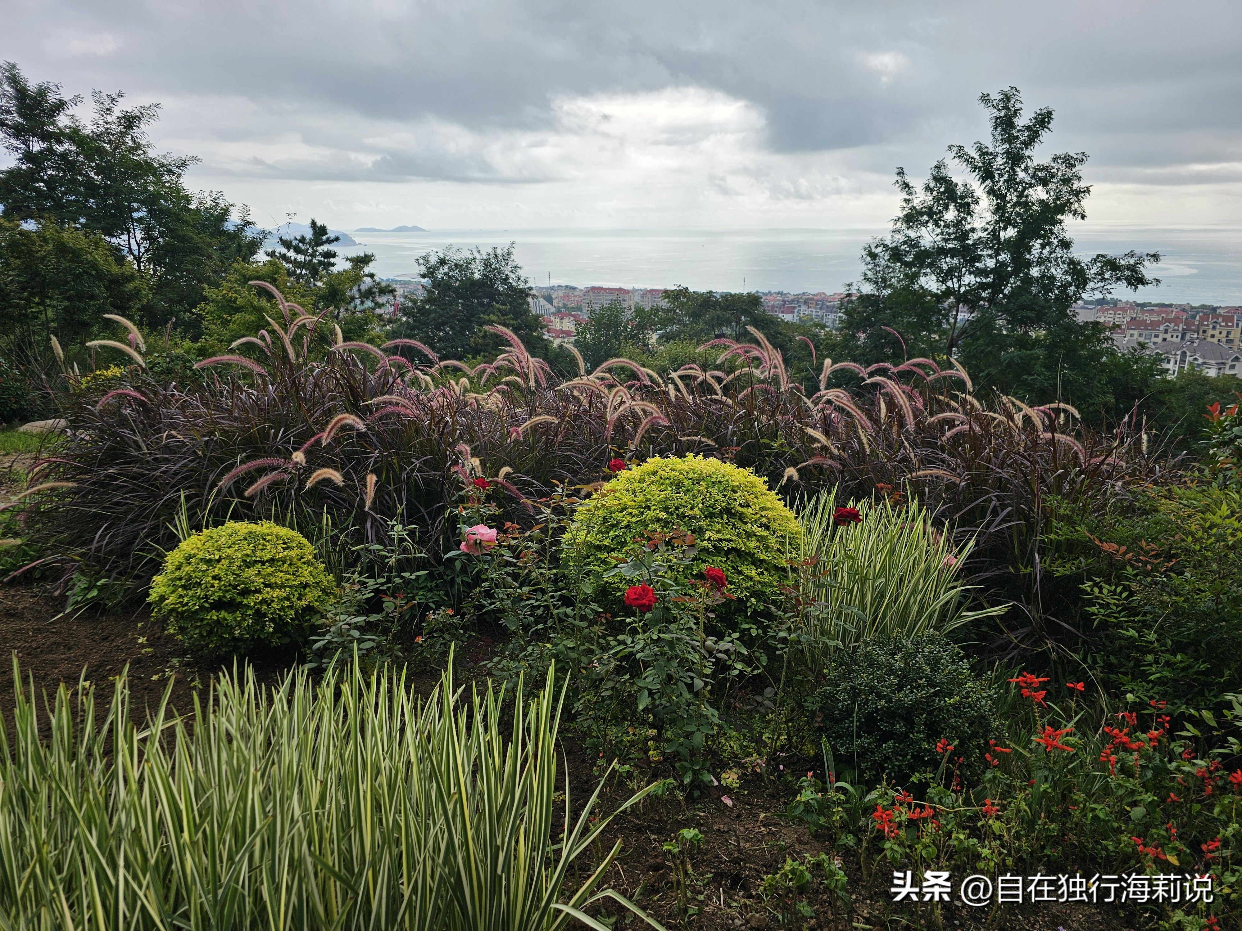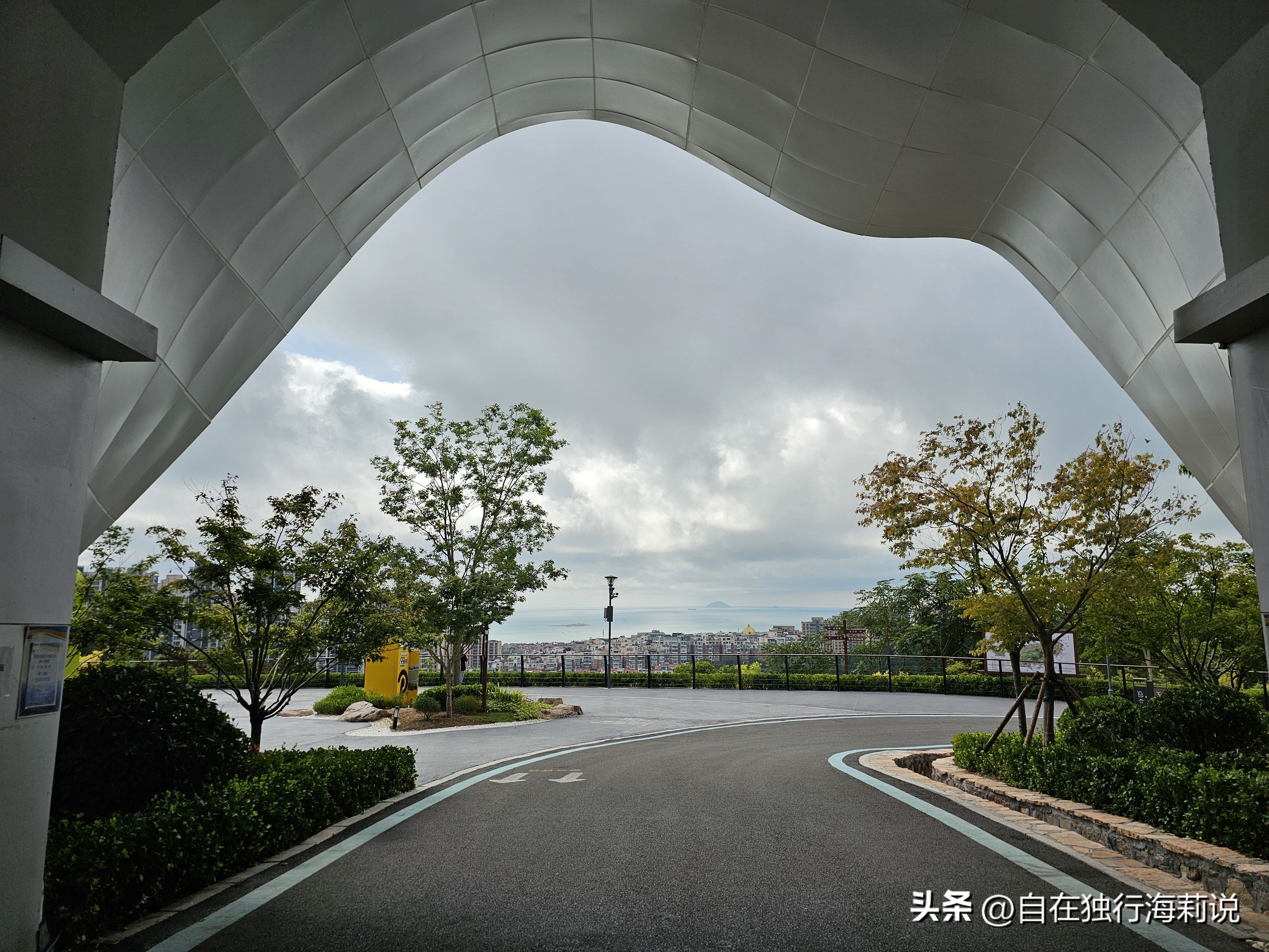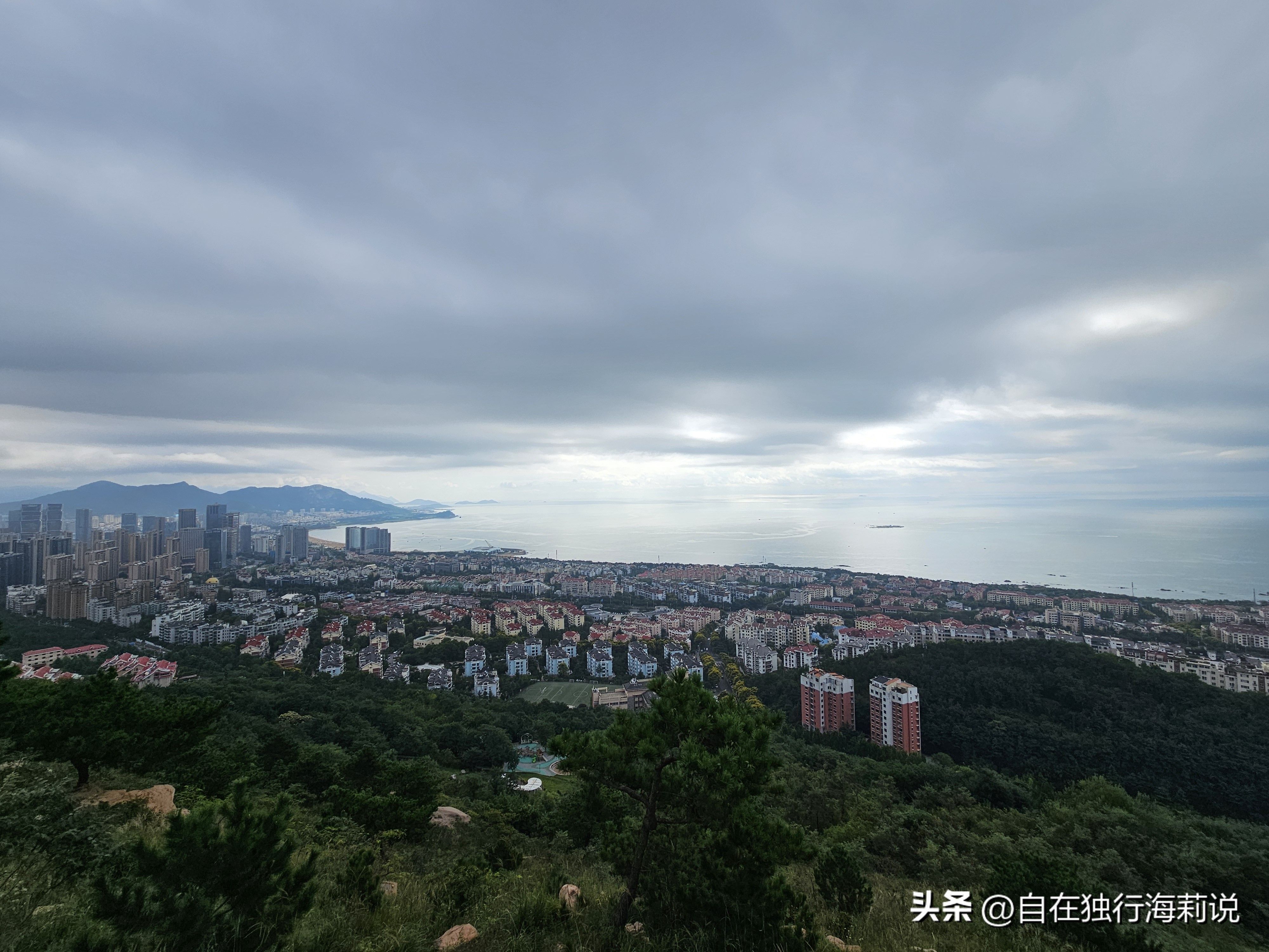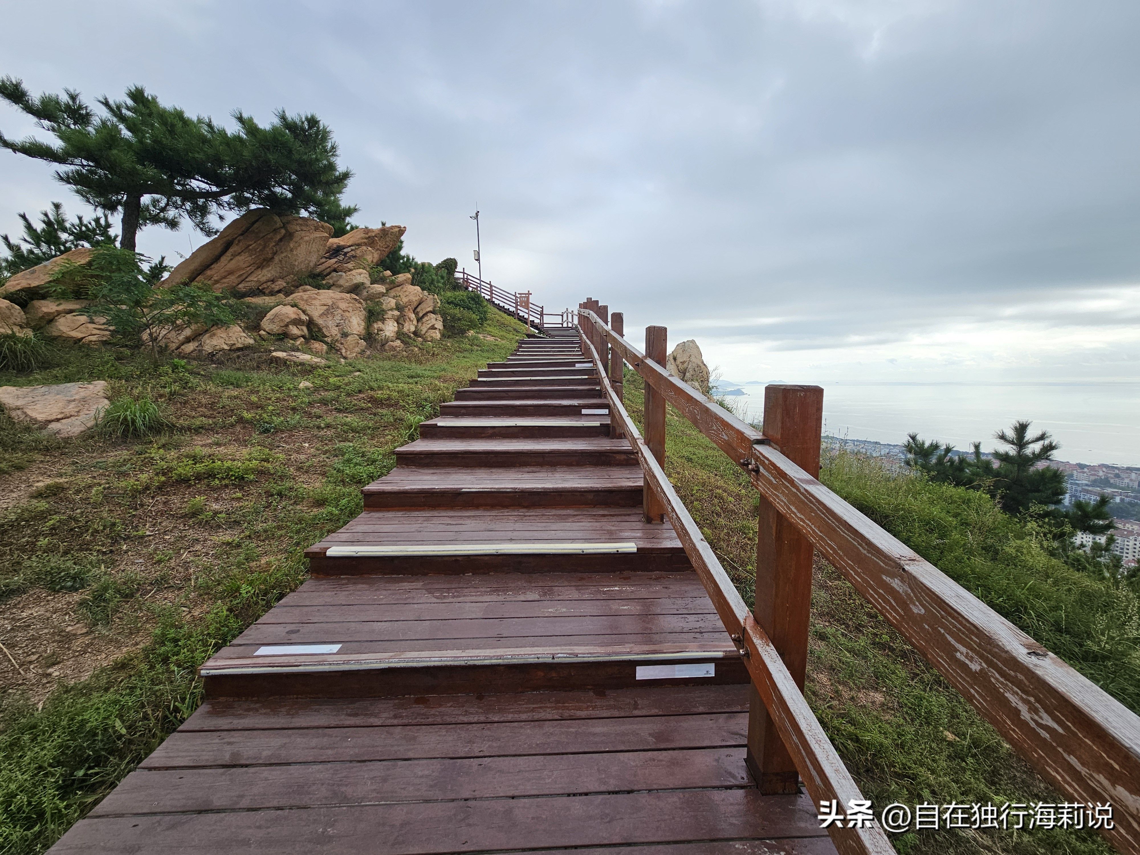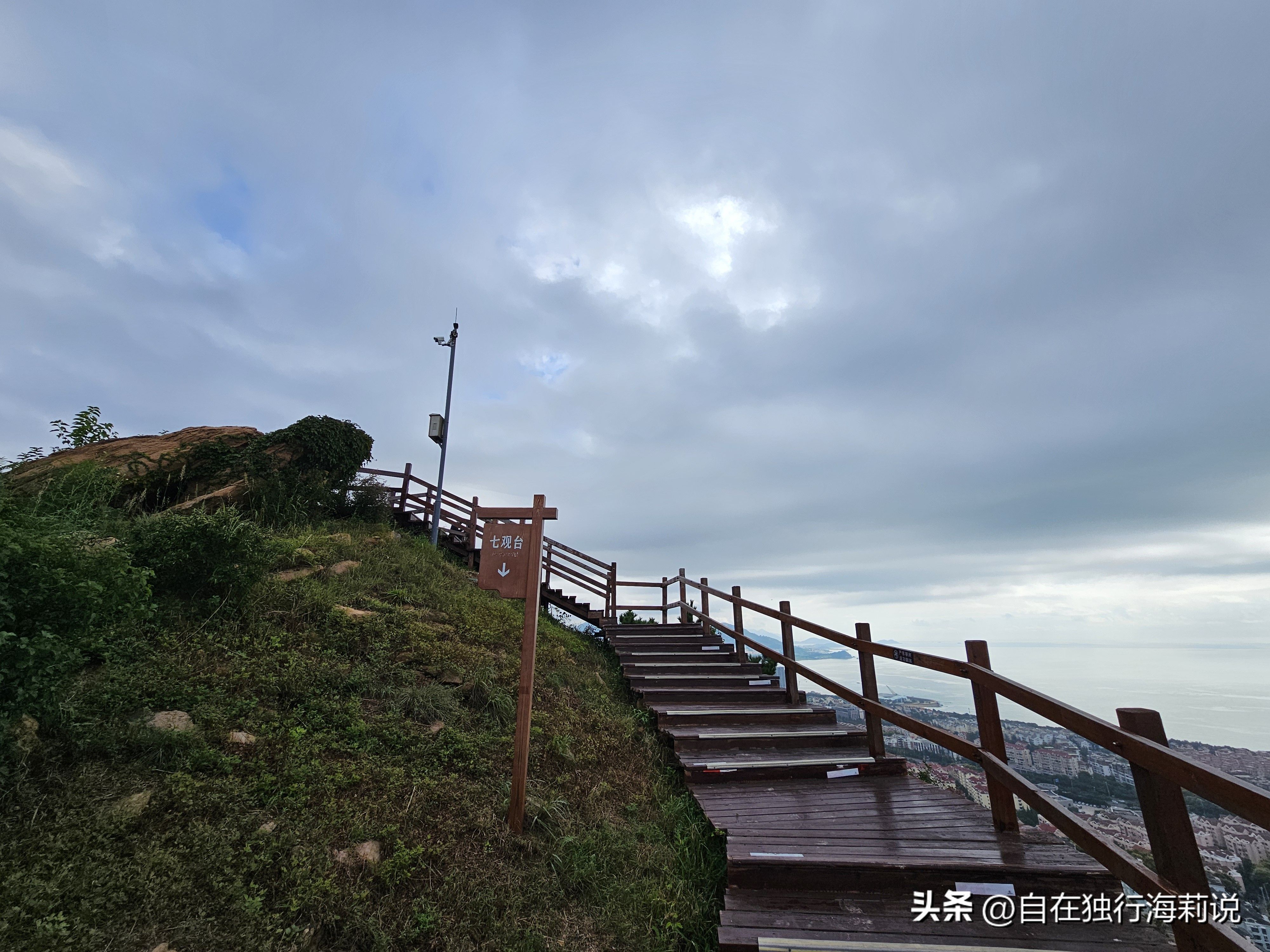 图三到图六,沿着观海路木栈道一路上山,一路都可以观山赏海景。木栈道的尽头便是山顶观海平台,在此可以俯瞰半座岛城的大美景色,山景、城景、海景,尽收眼底。碧海蓝天,美轮美奂,红瓦白房,如诗如画,翠峰巍峨,磅礴大气。舒爽的秋风,醉美的风景,令人心旷神怡,流连忘返。