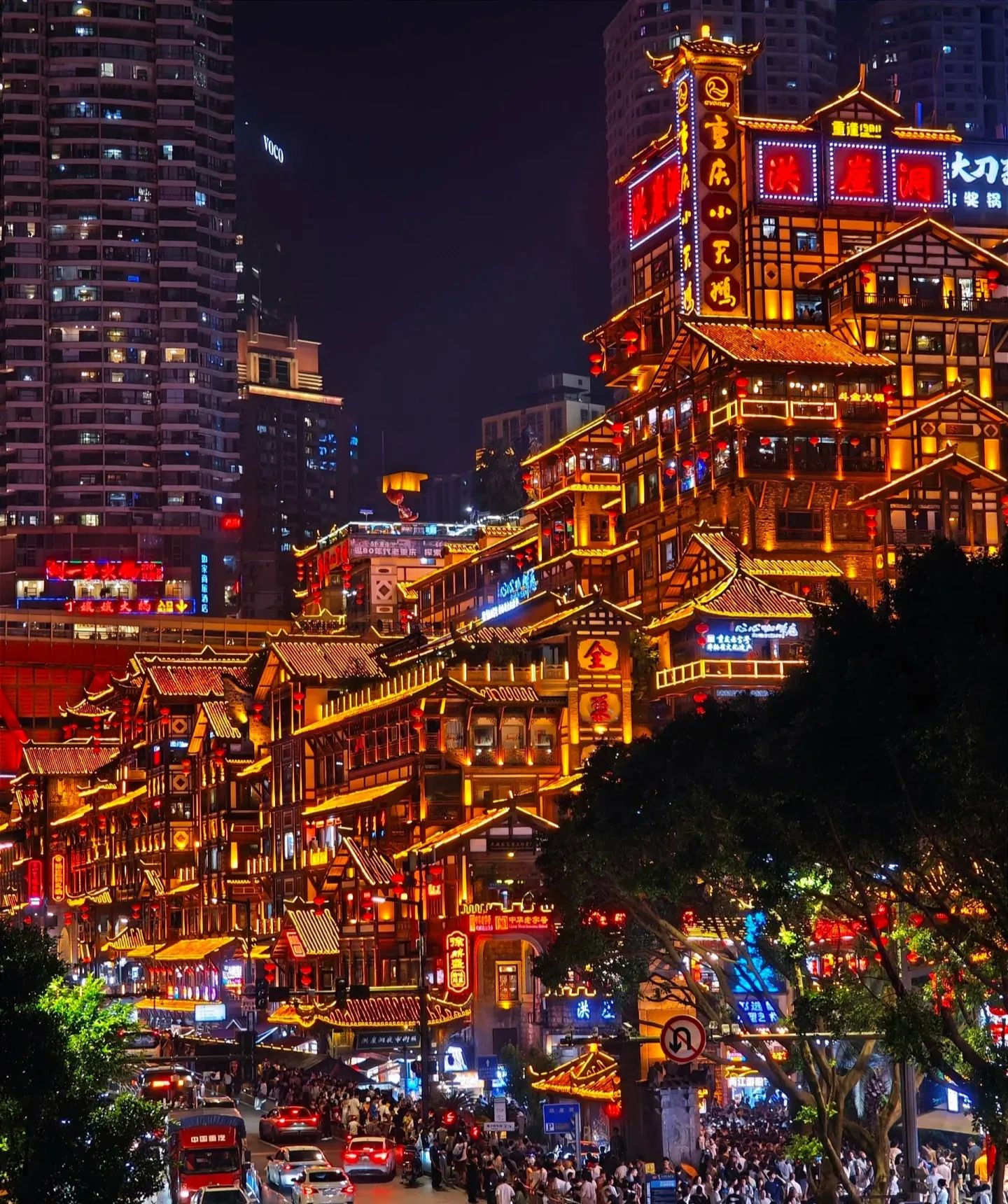 重庆:洪崖洞夜景免费拍!8D魔幻地形自带朋克滤镜,30元火锅管饱(建议跟本地嬢嬢拼桌更便宜)