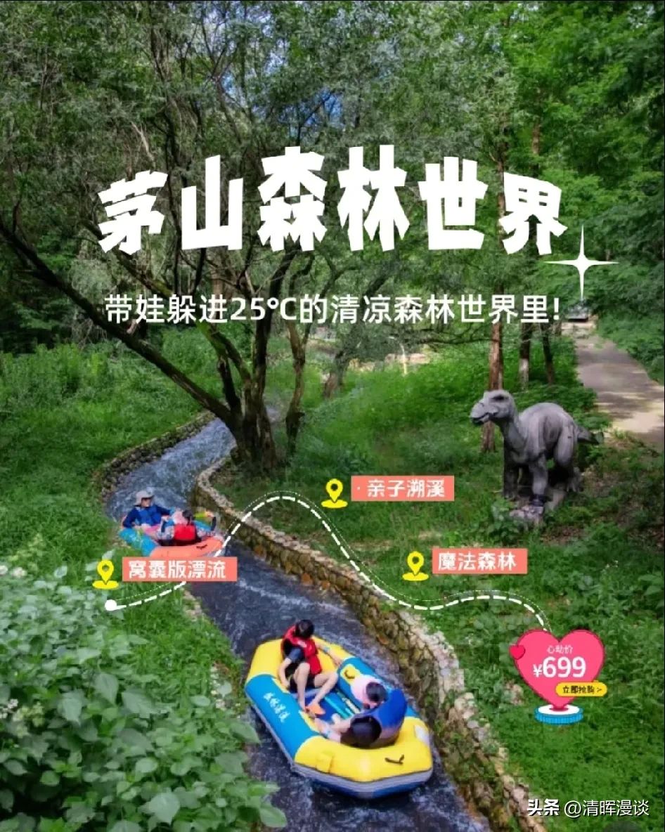 80%森林覆盖率,自带天然遮阳效果,河道平缓,夜间还有灯光漂流场,适合亲子家庭。