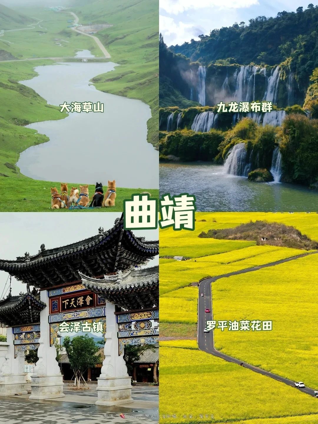 曲靖|景点:大海草山、九龙瀑布群、会泽古镇、罗平油菜花|美食:宣威火腿、陆良板鸭、罗平烟熏肉