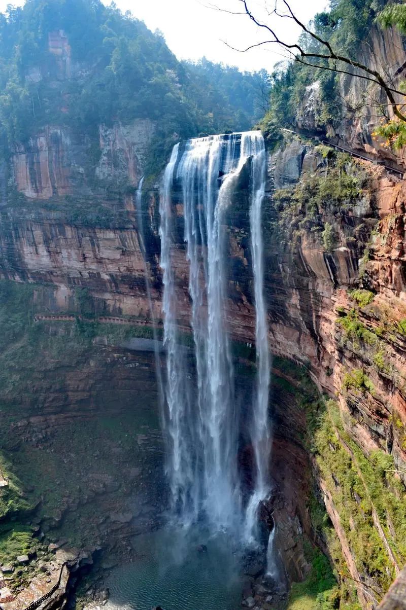 首站直奔望乡台瀑布,158米高的丹霞瀑布在晨光中折射出彩虹,建议用广角镜头捕捉“心形”岩壁与飞瀑交融的震撼画面。随后乘坐观光车前往洪海景区,乘竹筏穿行龙潭湖,偶遇野生猕猴群,感受“舟行碧波上,人在画中游”的意境。