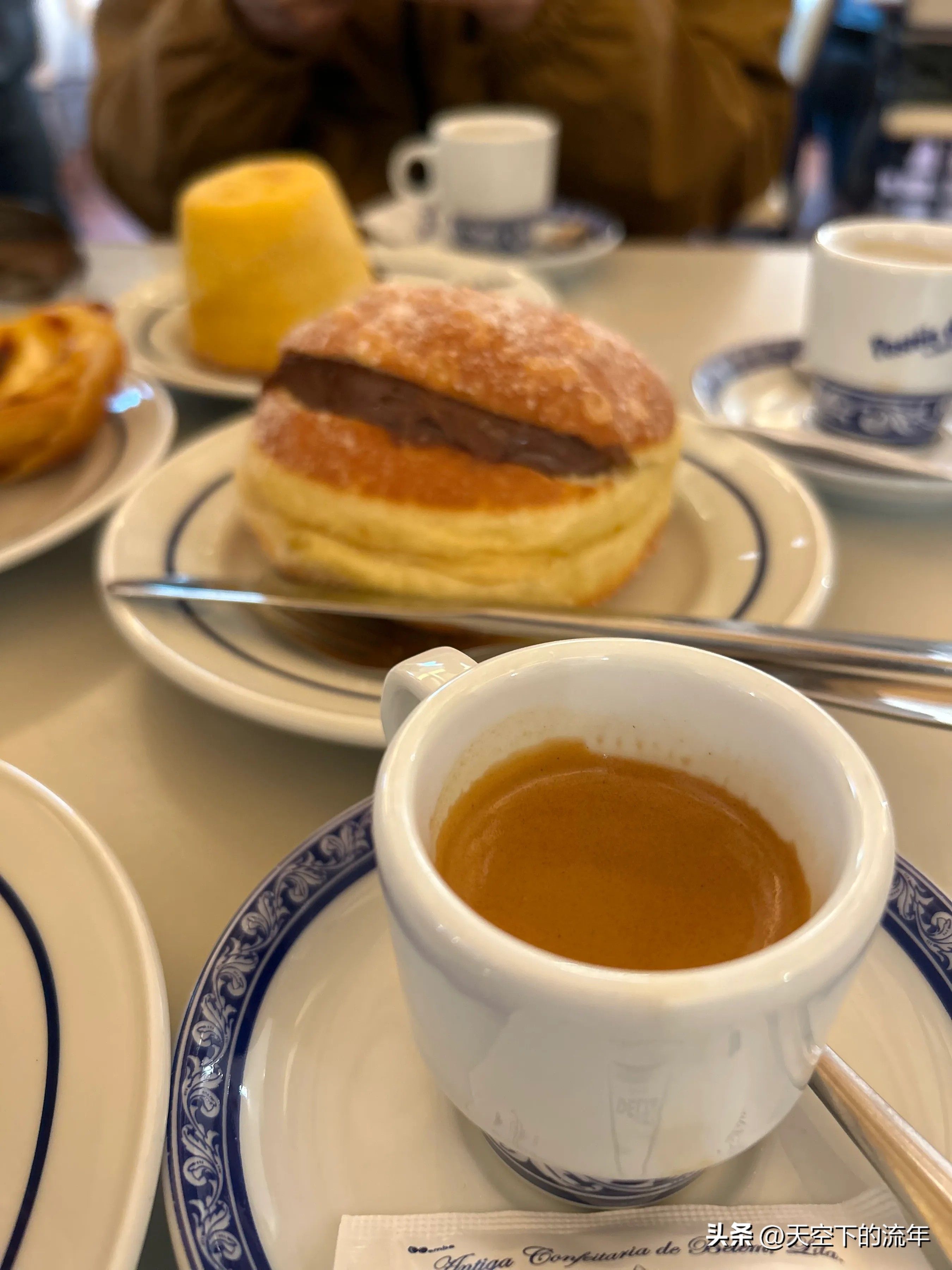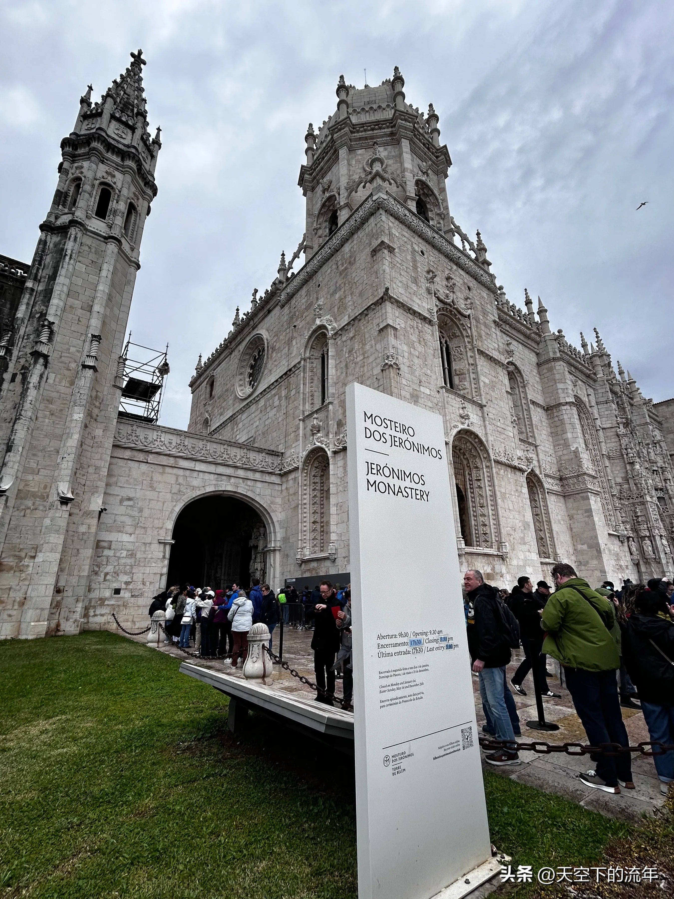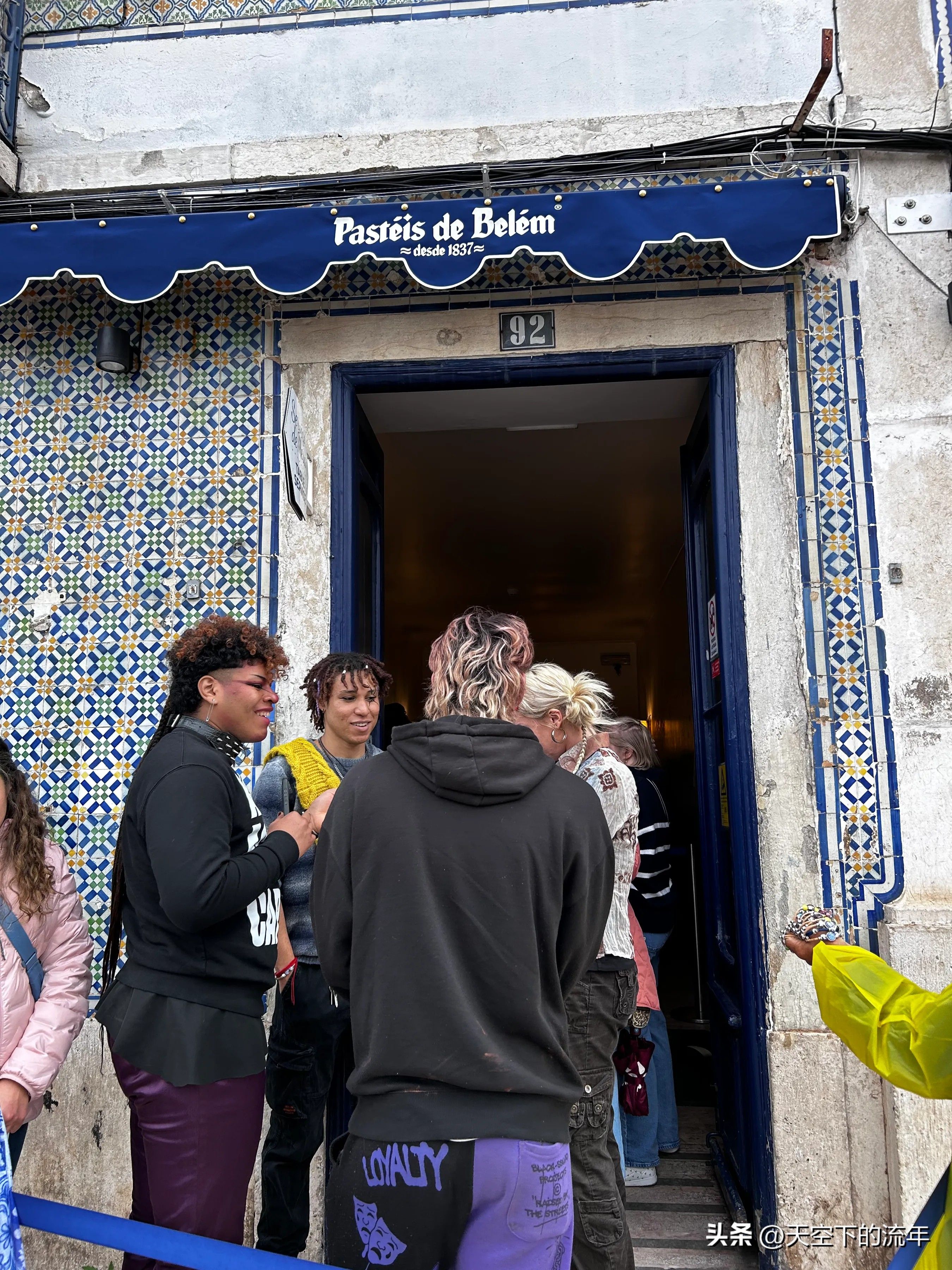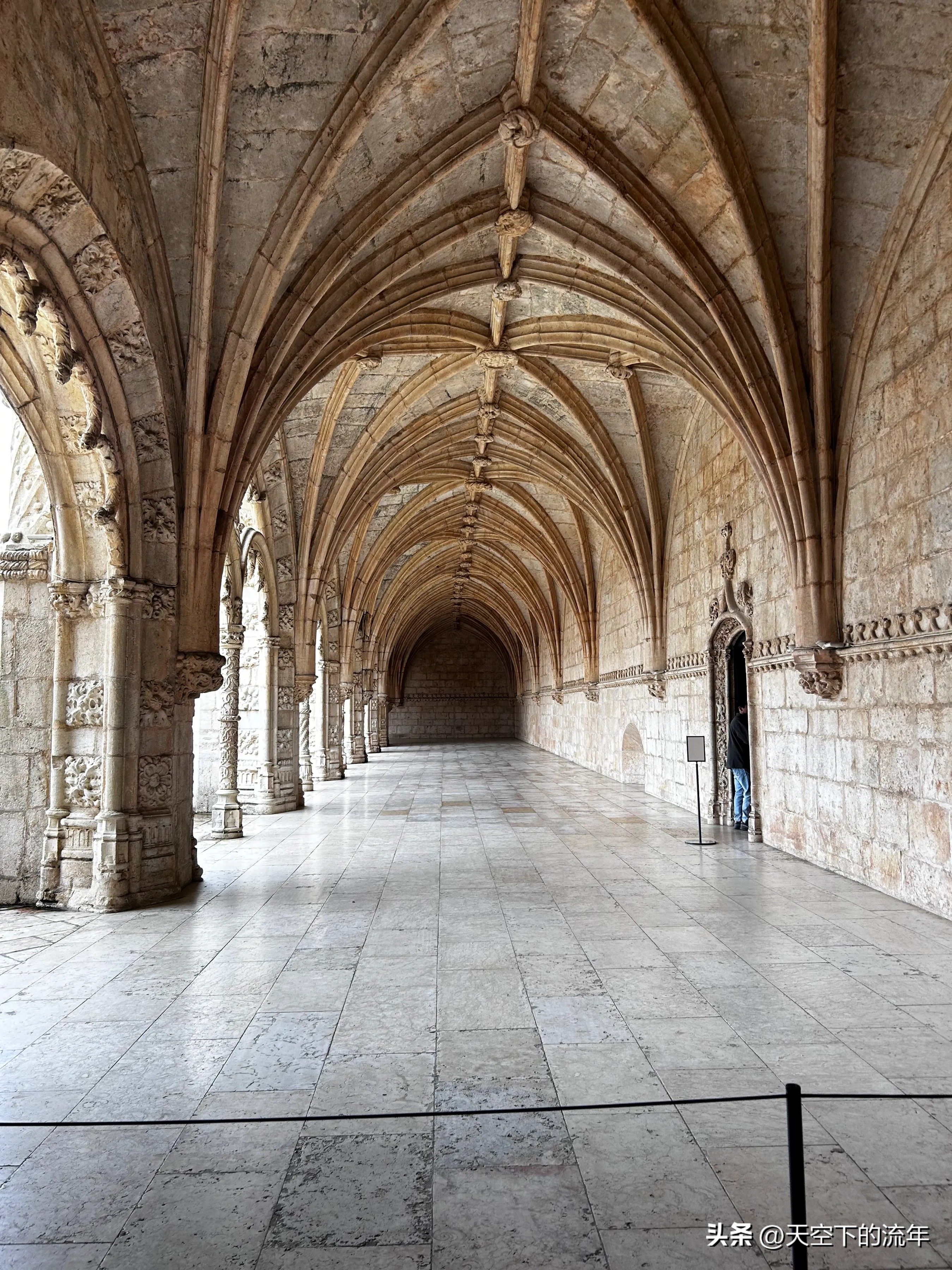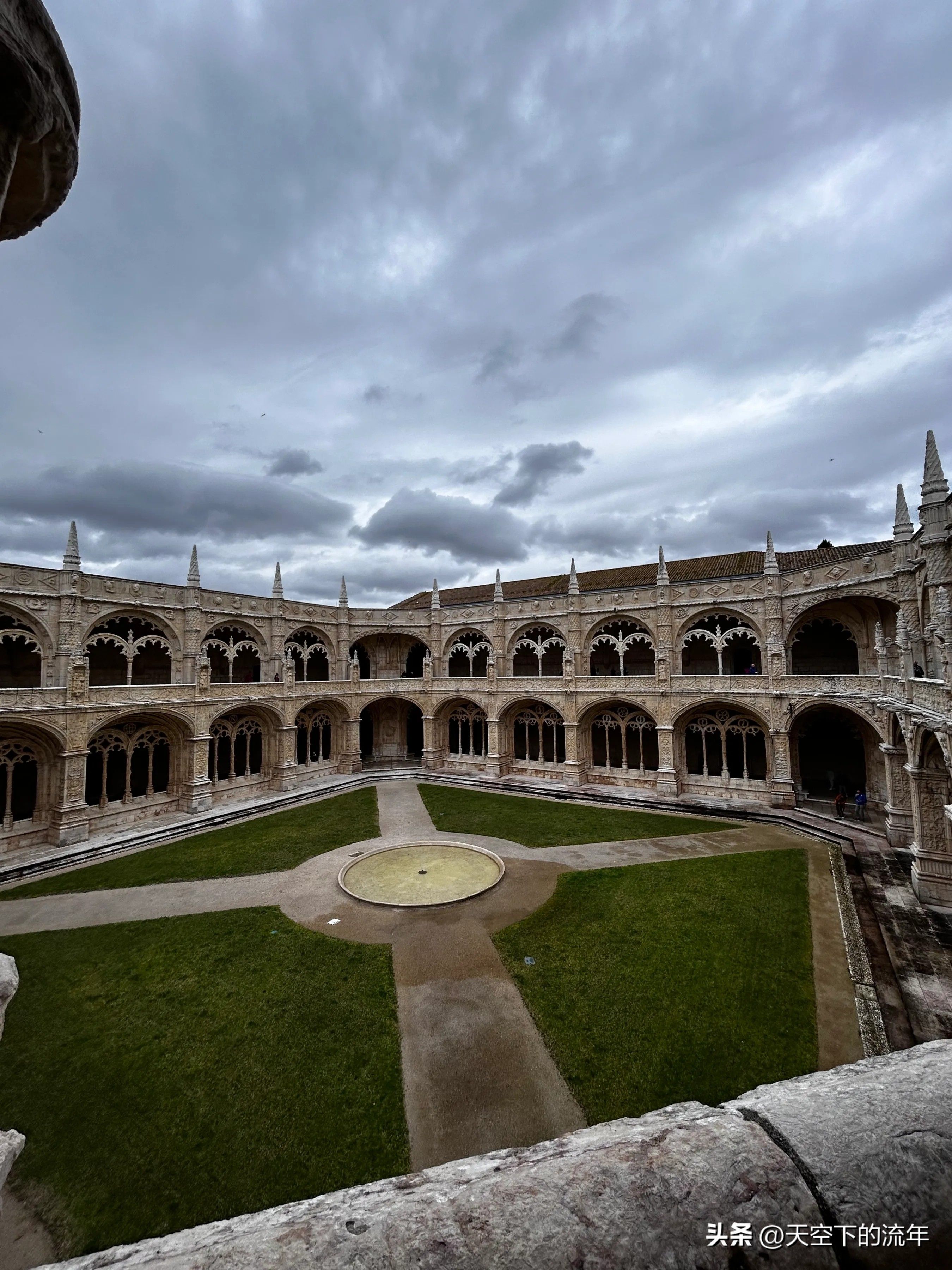 第二天果然狂风大作,打车去贝伦区时司机直摇头:“这天气去贝伦塔要挨浇啊!”。路上经过了航海纪念碑。热罗尼莫斯修道院(Mosteiro dos Jerónimos)比想象中还壮观,曼努埃尔式建筑特有的航海元素布满外墙,缆绳浮雕缠绕石柱,贝壳装饰点缀拱顶。可惜雨越下越大,我们放弃步行去贝伦塔的计划,躲进百年老店Pasteis de Belém。这家蛋挞创始店门脸只有三米宽,进去才发现别有洞天:蓝白瓷砖走廊连接着十几个厅堂,我们点了蛋挞配浓缩咖啡,热乎乎的酥皮确实比昨天的更香脆。