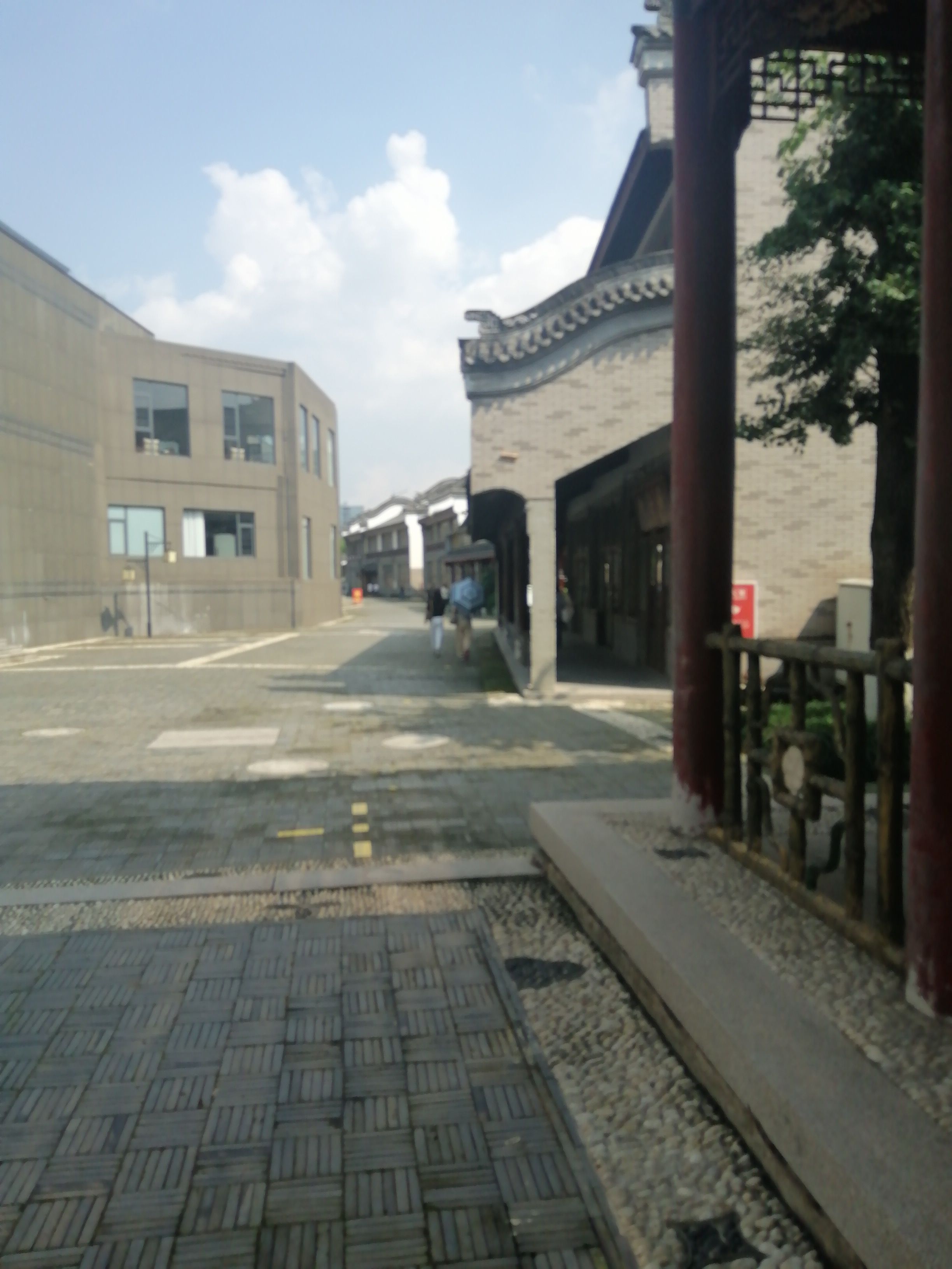 我专门乘地铁17号线,从九江北到威灵站,(西南财大天府学院)也在此同站。出了地铁站口,即可见到带有古香古色,偏暗红色的仿古建筑,红墙青瓦,飞檐拱斗,均是用水泥,砖瓦修成,涂成暗红色的。石板铺成的路,造成仿古的感觉。