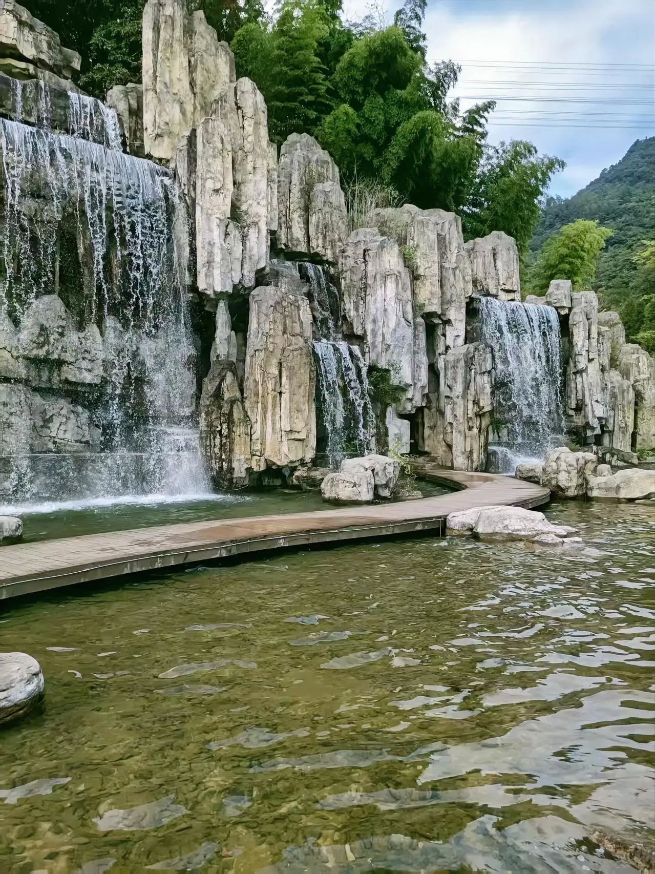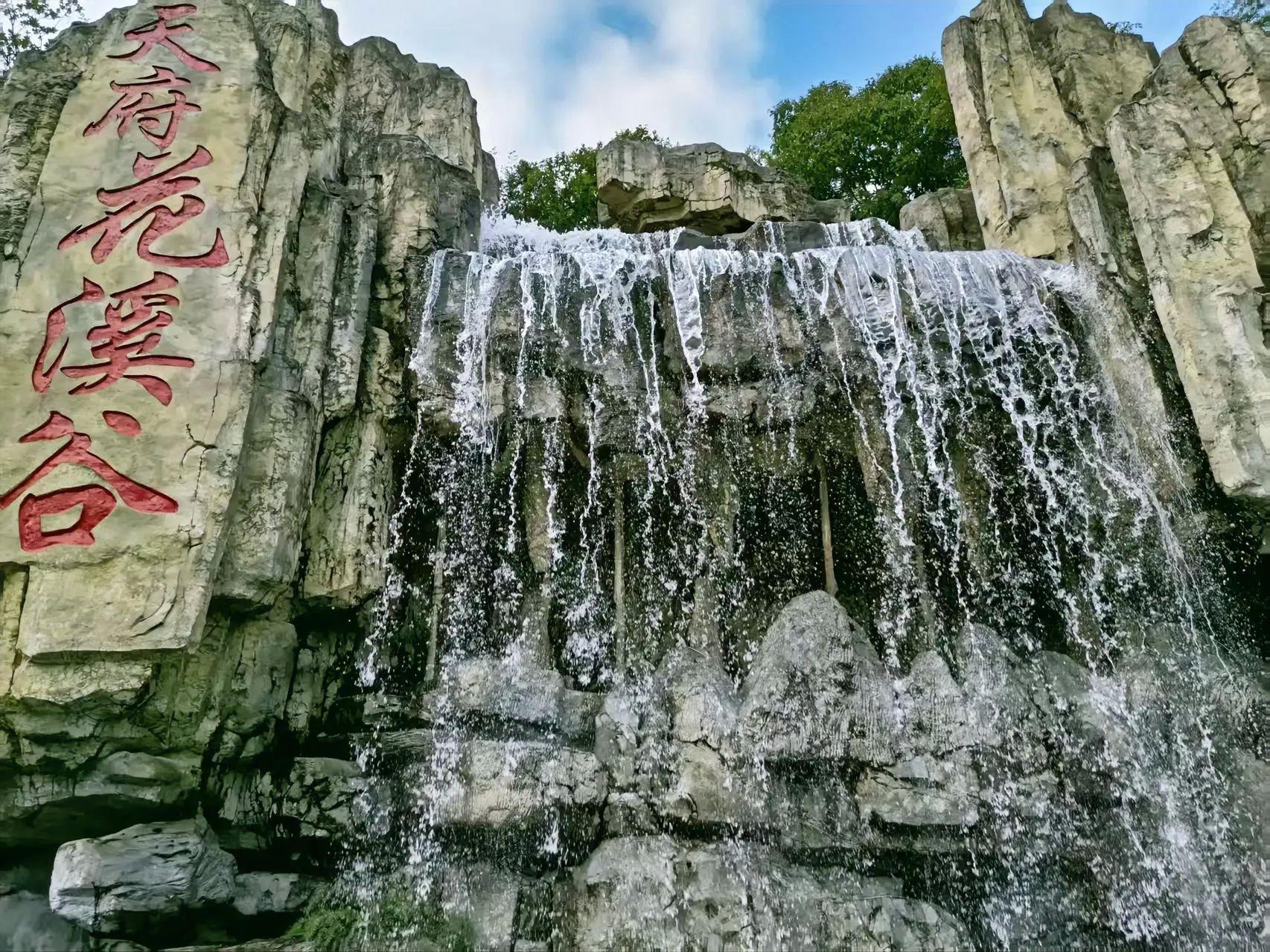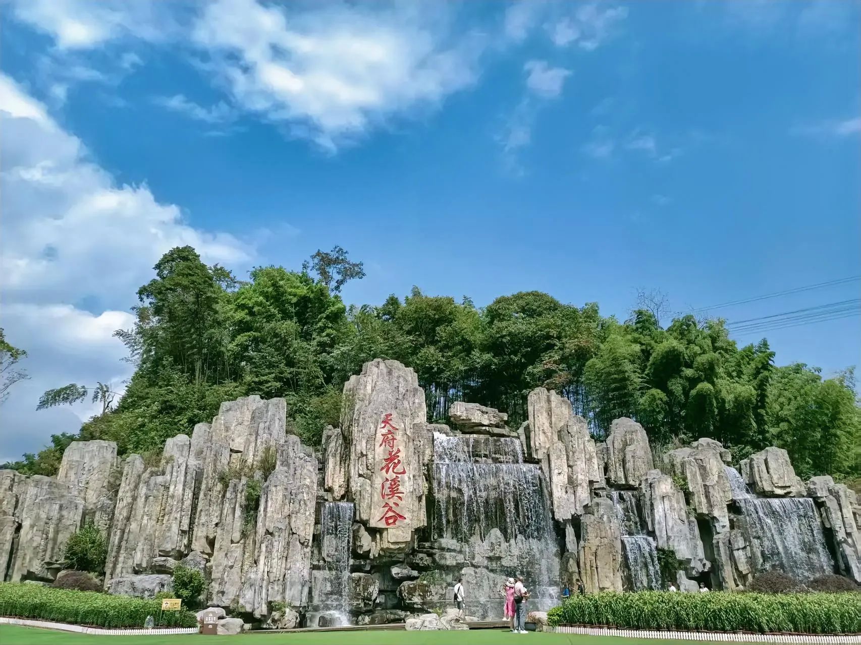 踏入天府花溪谷,首先映入眼帘的是那气势恢宏的假山瀑布景观。“天府花溪谷”几个大字苍劲有力,镌刻于石上,瀑布从假山顶端倾泻而下,如白练悬空,水花飞溅,瞬间带来清凉与舒爽。这灵动的水瀑,与古朴的山石相融,仿佛一幅天然的山水画卷,还未深入谷中,便已叫人沉醉。