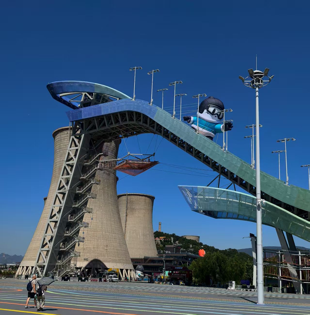 曾见证谷爱凌、苏翊鸣夺金的滑雪大跳台“雪飞天”,也是首钢园的一大亮点。其设计灵感源自敦煌“飞天”,与首钢园的工业旋律相得益彰。旁边的群明湖波光粼粼,与冷却塔、大跳台相互映衬,构成了一幅绝美的画面。