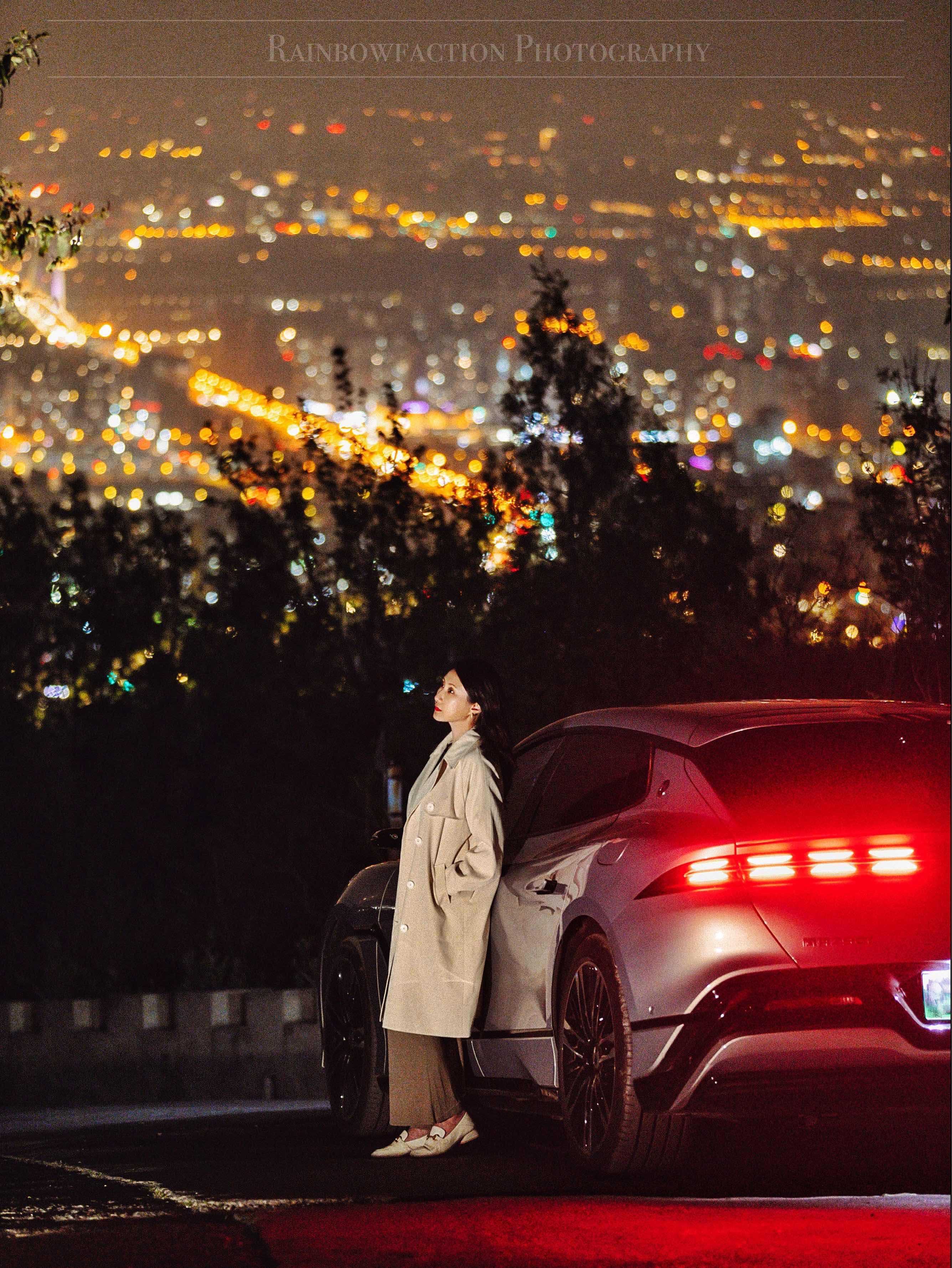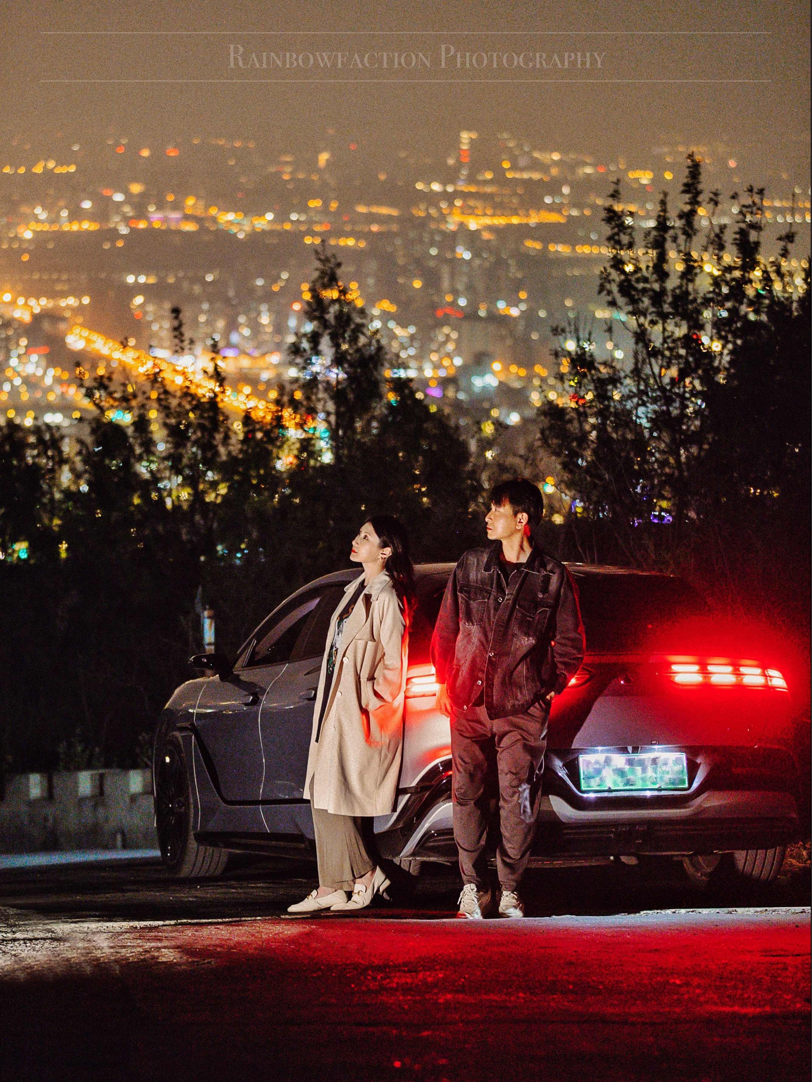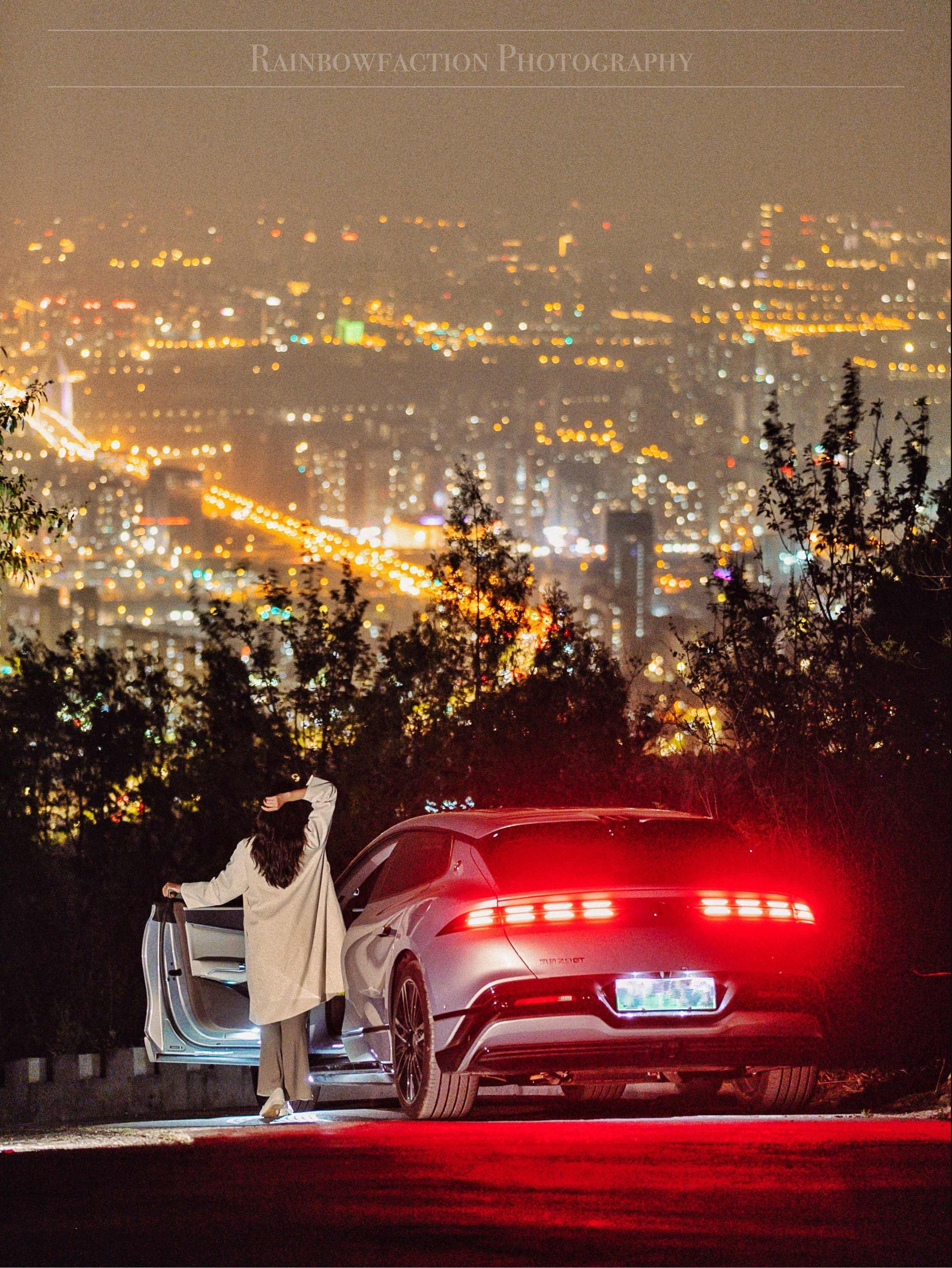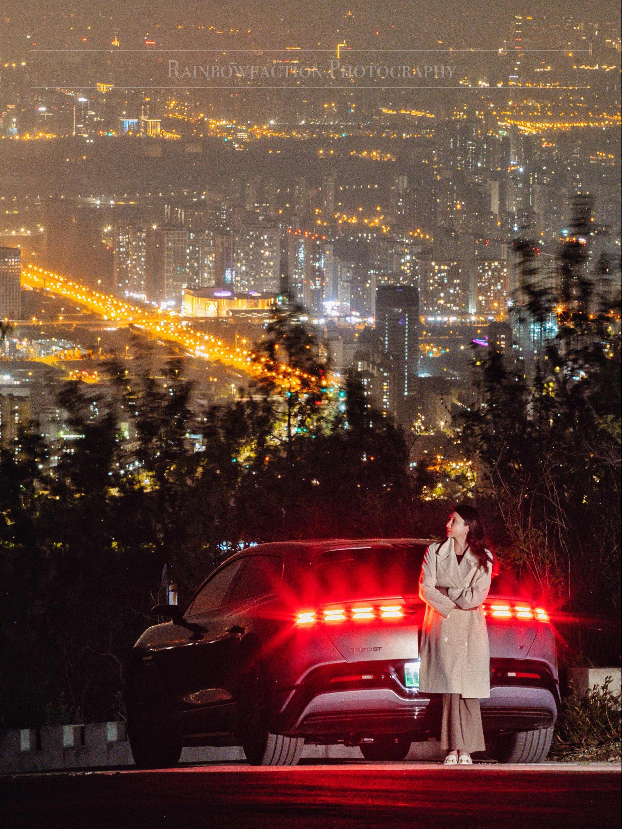 2、 到达观景平台后继续向前行驶,穿过赵家洼村后,一直开到通往定都阁小路的尽头(铁门挡住),调转车头后向下可寻找合适机位,拍摄城市夜景与车同框的美片。