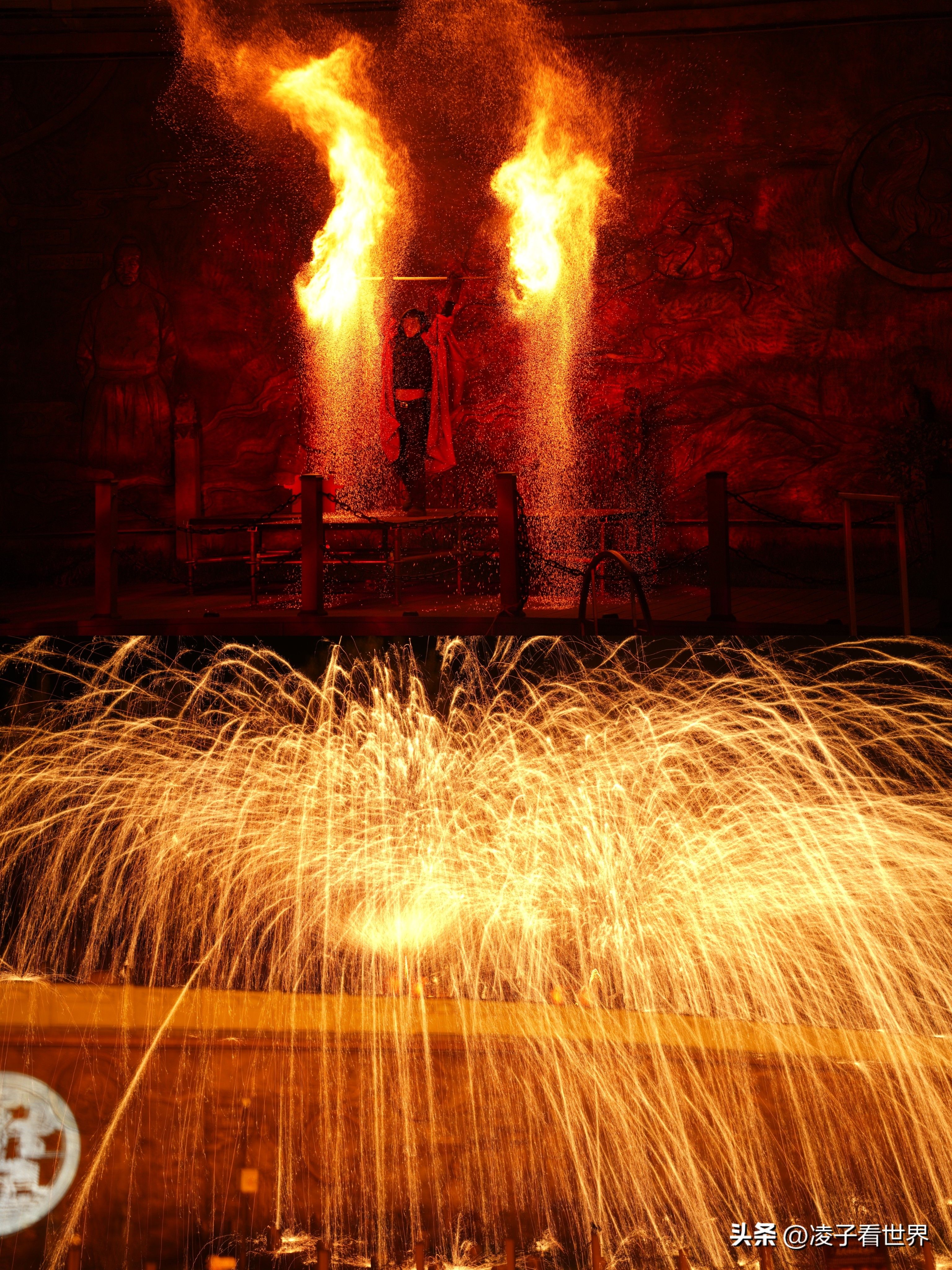 渤海古镇,红棕色仿唐建筑群瞬间带你穿越到海东盛国。古街上的唐式牌楼、副都统衙门都复刻了盛唐风貌。双节期间有各种表演,晚上夜景超美,主舞台的表演也达到高潮。河边的打铁花,水舞秀也不容错过。