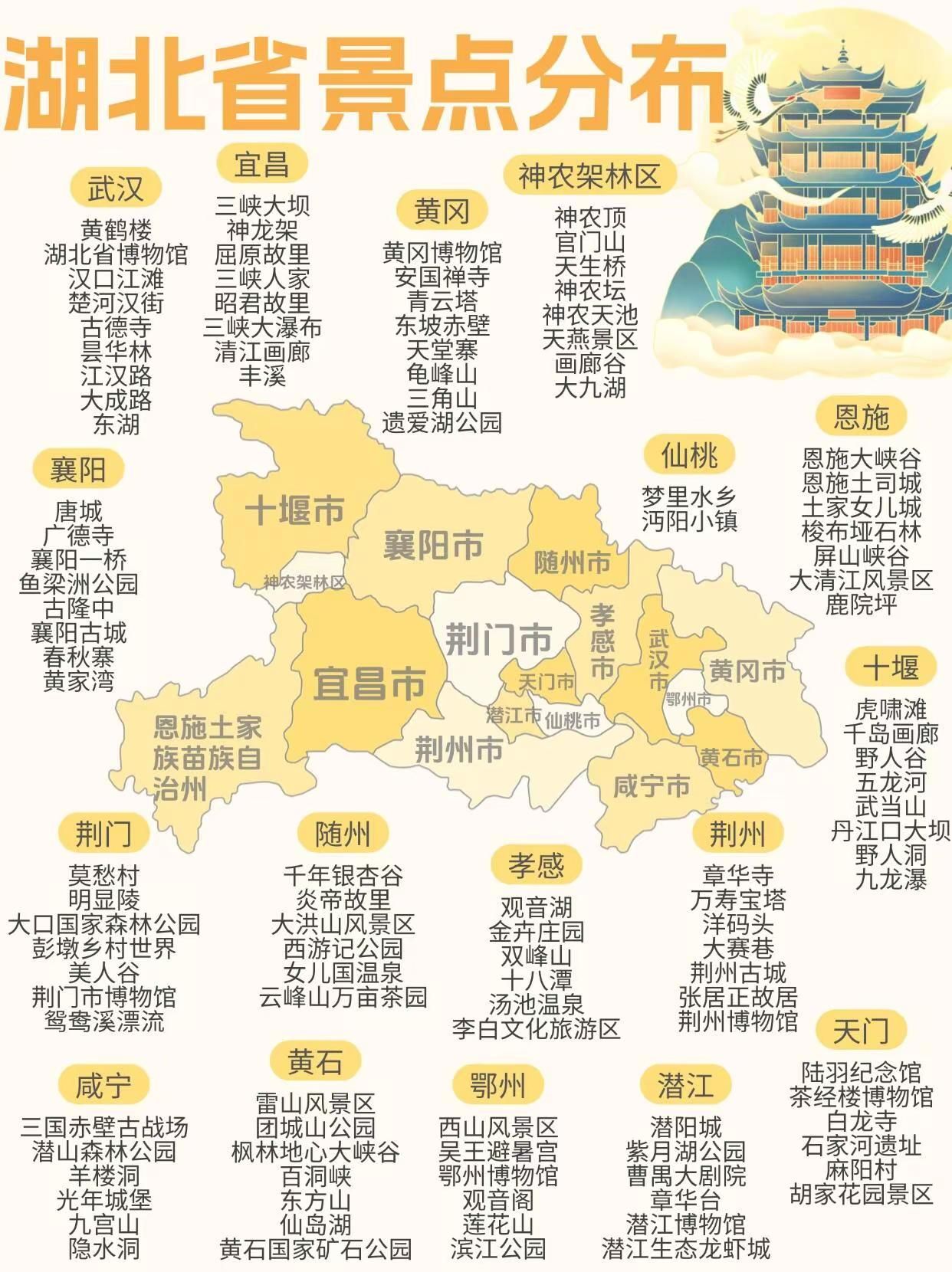 小小湖北一篇笔记稳稳拿下~小小湖北一篇笔记稳稳拿下~漫步在长江大桥上脚下是滚滚东逝水眼前时黄鹤楼的飞檐翘角·武汉的美让人心动不已武汉市黄鹤楼、湖北省博物馆、汉口江滩、楚河汉街、古德寺、昙华林、江汉路、大成路、东湖宜昌市三峡大坝、神龙架、屈原故里、三峡人家、昭君故里、三峡大瀑布、清江画廊、丰溪十堰市虎啸滩、千岛画廊、野人谷、五龙河、武当山、丹江口大坝、野人洞、九龙瀑襄阳市唐城、广德寺、襄阳一桥、鱼梁洲公园、古隆中、襄阳古城、春秋寨、黄家湾随州市千年银杏谷、炎帝故里、大洪山风景区、西游记公园、女儿国温泉、云峰山万亩茶园黄冈市黄冈博物馆、安国禅寺、青云塔、东坡赤壁、天堂寨、龟峰山、三角山、遗爱湖公园神农架林区神农顶、官门山、天生桥、神农坛、神农天池、天燕景区、画廊谷、大九湖荆门市莫愁村、明显陵、大口国家森林公园、彭墩乡村世界、美人谷、荆门市博物馆、鸳鸯溪漂流孝感市观音湖、金卉庄园、双峰山、十八潭、汤池温泉、李白文化旅游区鄂州市西山风景区、吴王避暑宫、鄂州博物馆、观音阁、莲花山、滨江公园黄石市雷山风景区、团城山公园、枫林地心大峡谷、百洞峡、东方山、仙岛湖、黄石国家矿石公园咸宁市三国赤壁古战场、潜山森林公园、羊楼洞、光年城堡、九宫山、隐水洞仙桃市梦里水乡、沔阳小镇潜江市潜阳城、紫月湖公园、曹禺大剧院、章华台、潜江博物馆、潜江生态龙虾城天门市陆羽纪念馆、茶经楼博物馆、白龙寺、石家河遗址、麻阳村、胡家花园景区荆州市章华寺、万寿宝塔、洋码头、大赛巷、荆州古城、张居正故居、荆州博物馆恩施土家族苗族自治州恩施大峡谷、恩施土司城、土家女儿城、梭布垭石林、屏山峡谷、大清江风景区、鹿院坪·以上是对湖北各省份景点分布的一个简要介绍打算来湖北旅游但不知道怎么规划的朋友们可以选择咖喱哦为您安排线路或者定制专门化的旅游安排哦全程纯玩无购物心动的朋友可以在区留言【人数时间】或者直接私戳咖喱哦·#浪漫生活的记录者 #周末去哪儿 #湖北旅行攻略 #黄鹤楼夜游 #武汉旅游攻略