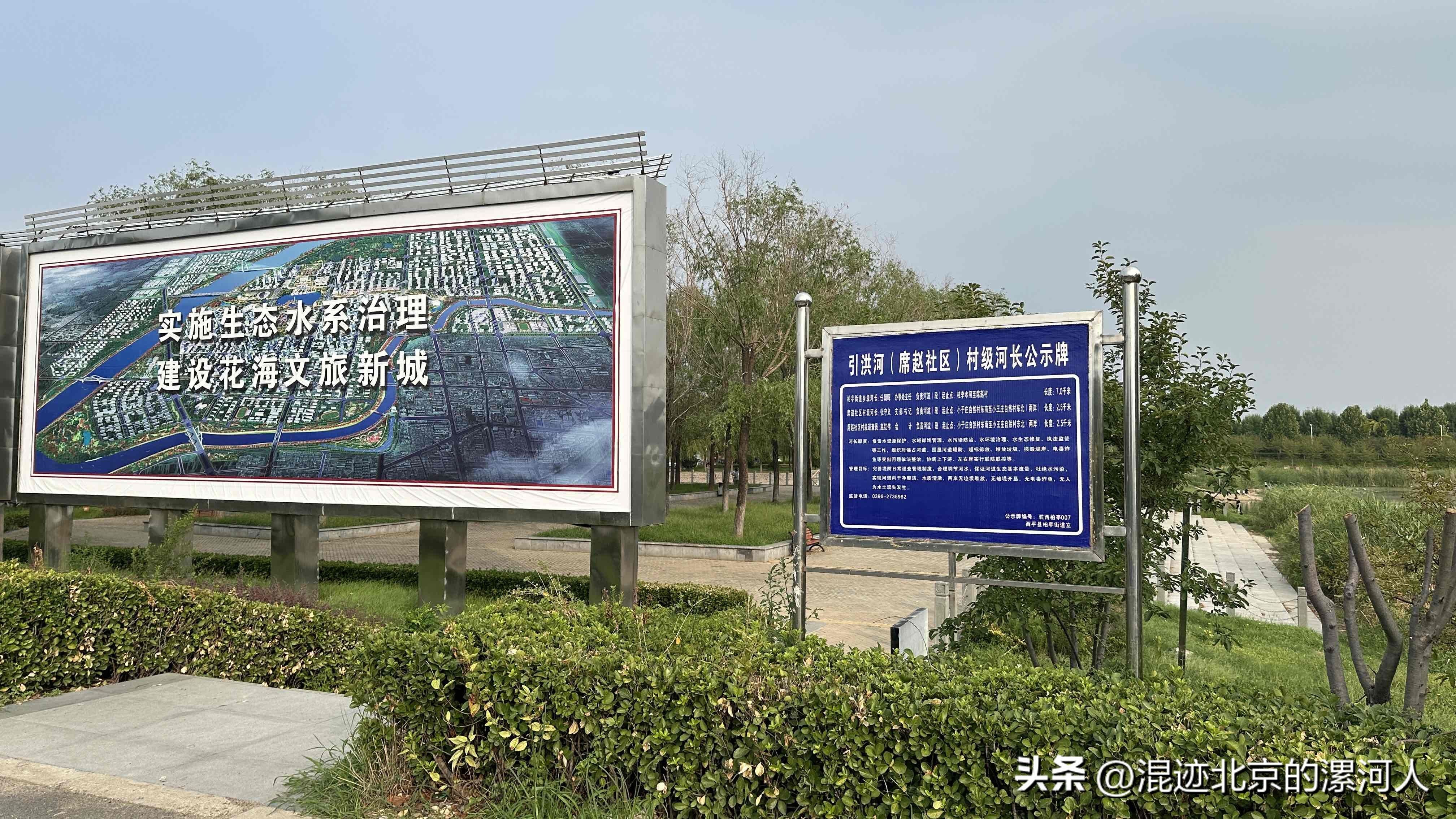 在漯西路上,我们一路南下,走至西平著名传说故事景点罗成坟时,导航提示我们右拐,进入一个不知名的公路,一直往西南行进大约三四公里,远远看到前面不远处有很多车辆停靠早路边,周围有一些小商贩很自觉的一字排开,摆摊卖零食水果或者美食。原来这就是传说中的橡皮坝。找了地方停好车,我们沿着河岸道路向南行进。在河沿处有两个大型宣传栏。一块宣传画上写着:实施生态水系治理,建设花海文旅新城;另一块是引洪河(席赵社区)村级河长公示牌。