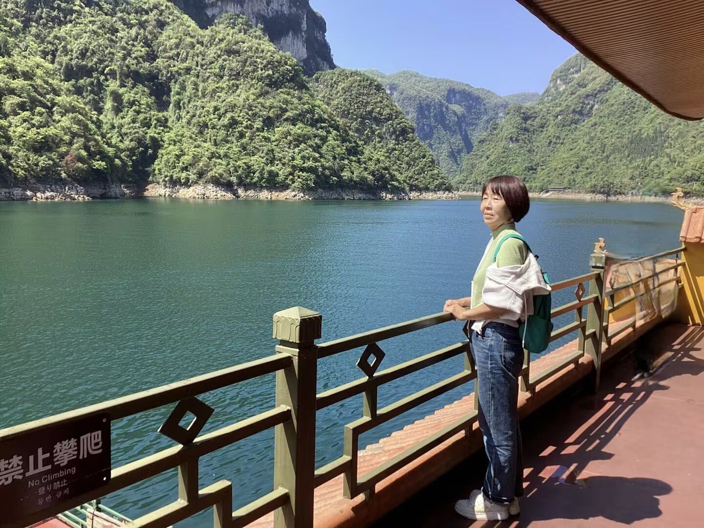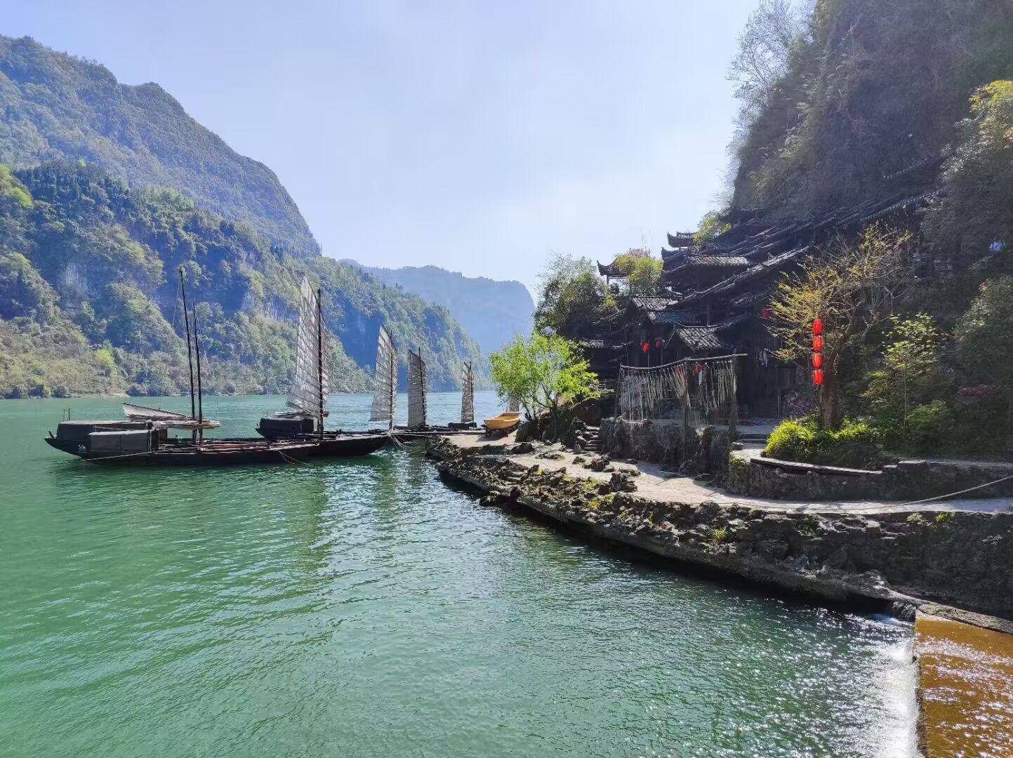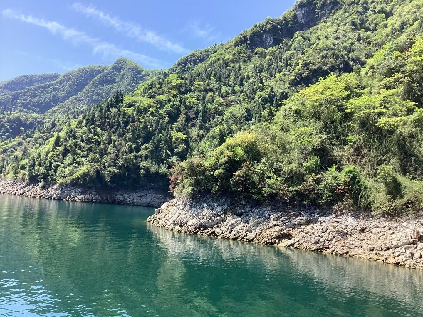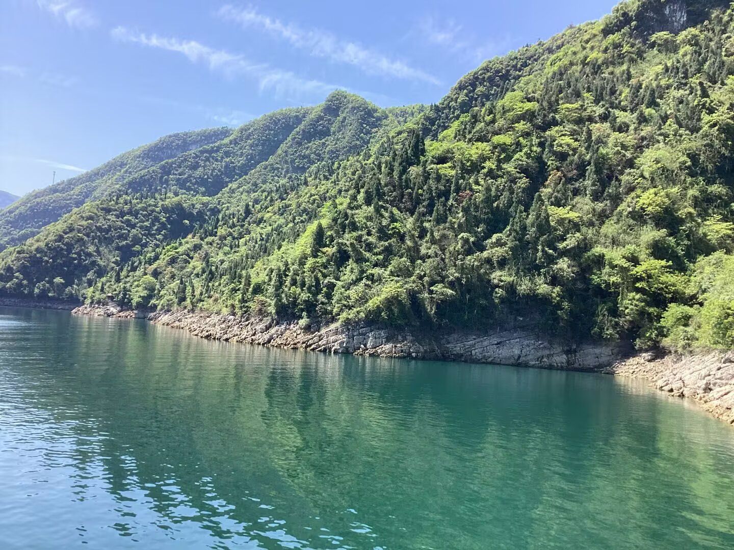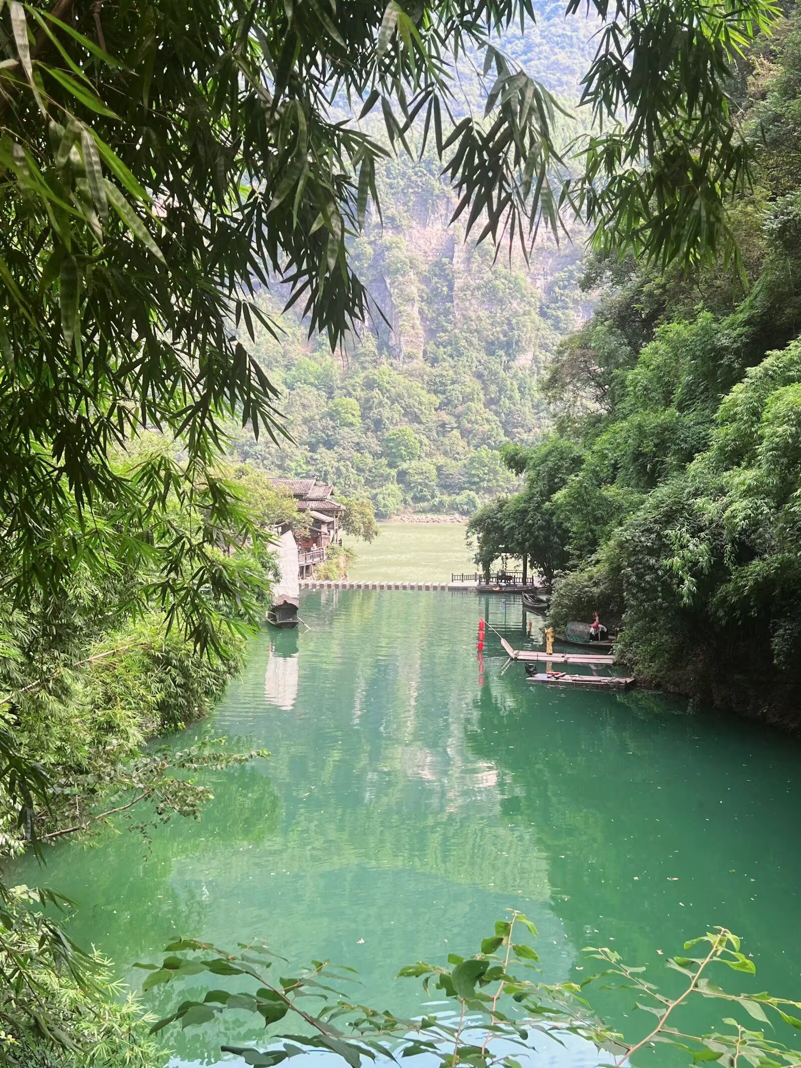 游船载着游客顺清江而下,所见风景宛如一幅流动的山水画卷向我们缓缓铺开。只见两岸的山峰跌宕起伏、延绵不绝,与清澈见底的清江水相映成趣,清江的水宛如绿色的翡翠,深邃而又透明。清江是一首抒情的诗、是一曲优美的歌、更是一幅迷人的画。